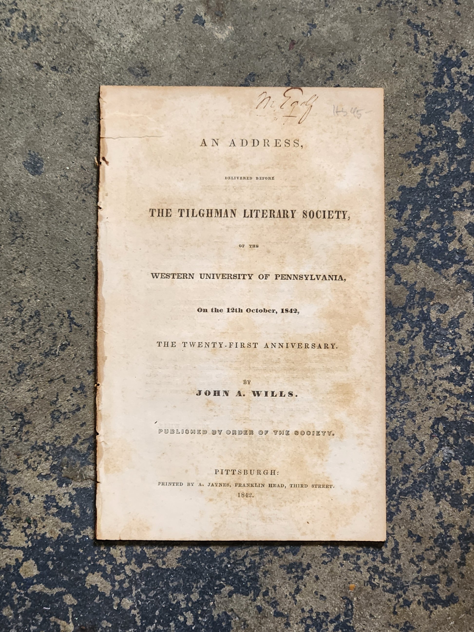 1842 An Address Before the Tilghman Literary Society — Western University of Pennsylvania — John A. Wills — Early Pittsburgh Imprint