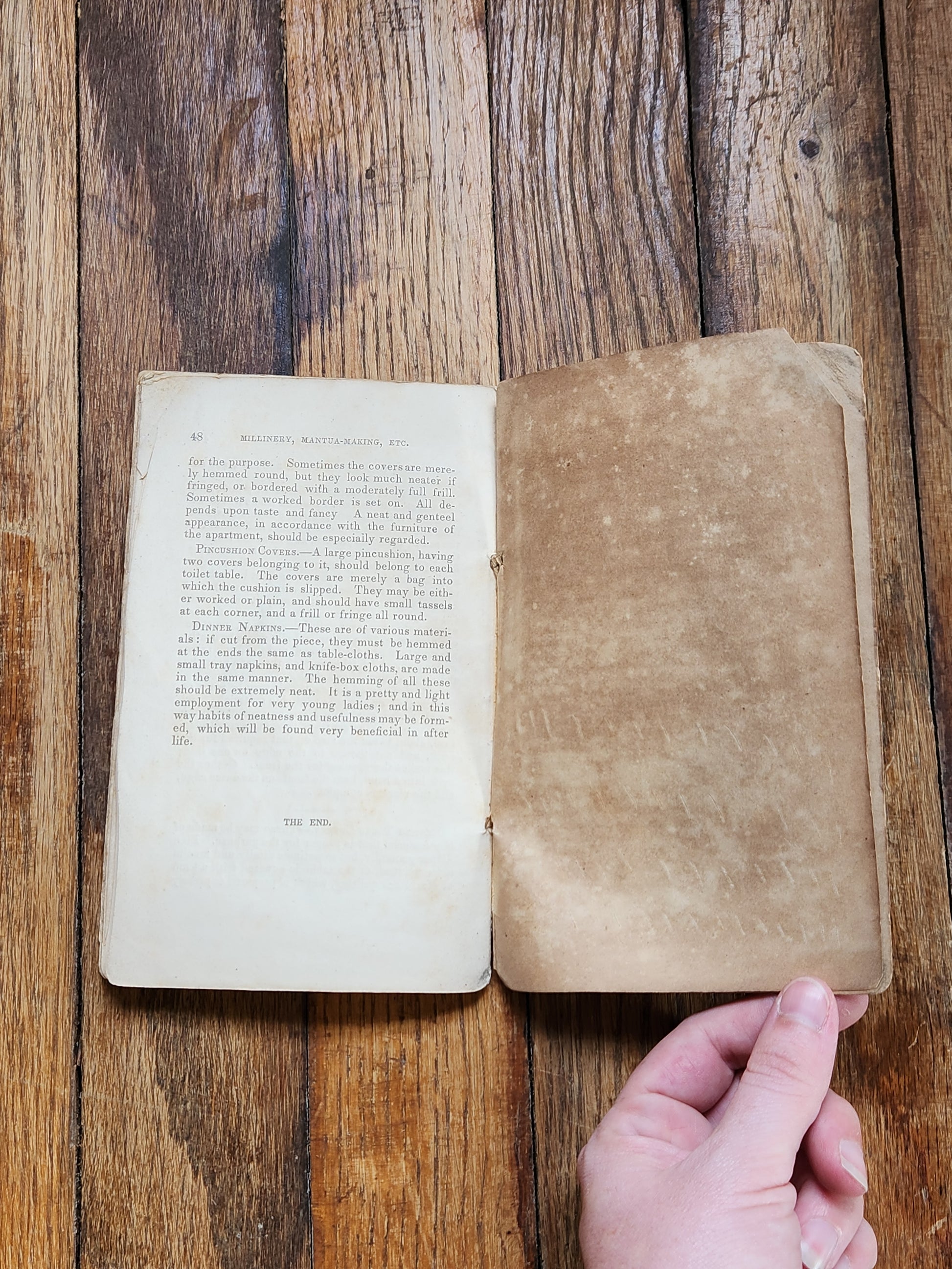 The Lady’s Self-Instructor in Millinery, Mantua Making, and All Branches of Plain Sewing, published by Burgess, Stringer & Co., New York, 1844. Part of the “Useful Books for the People” series, this scarce softcover volume was intended as an affordable guide for women in the mid-19th century.