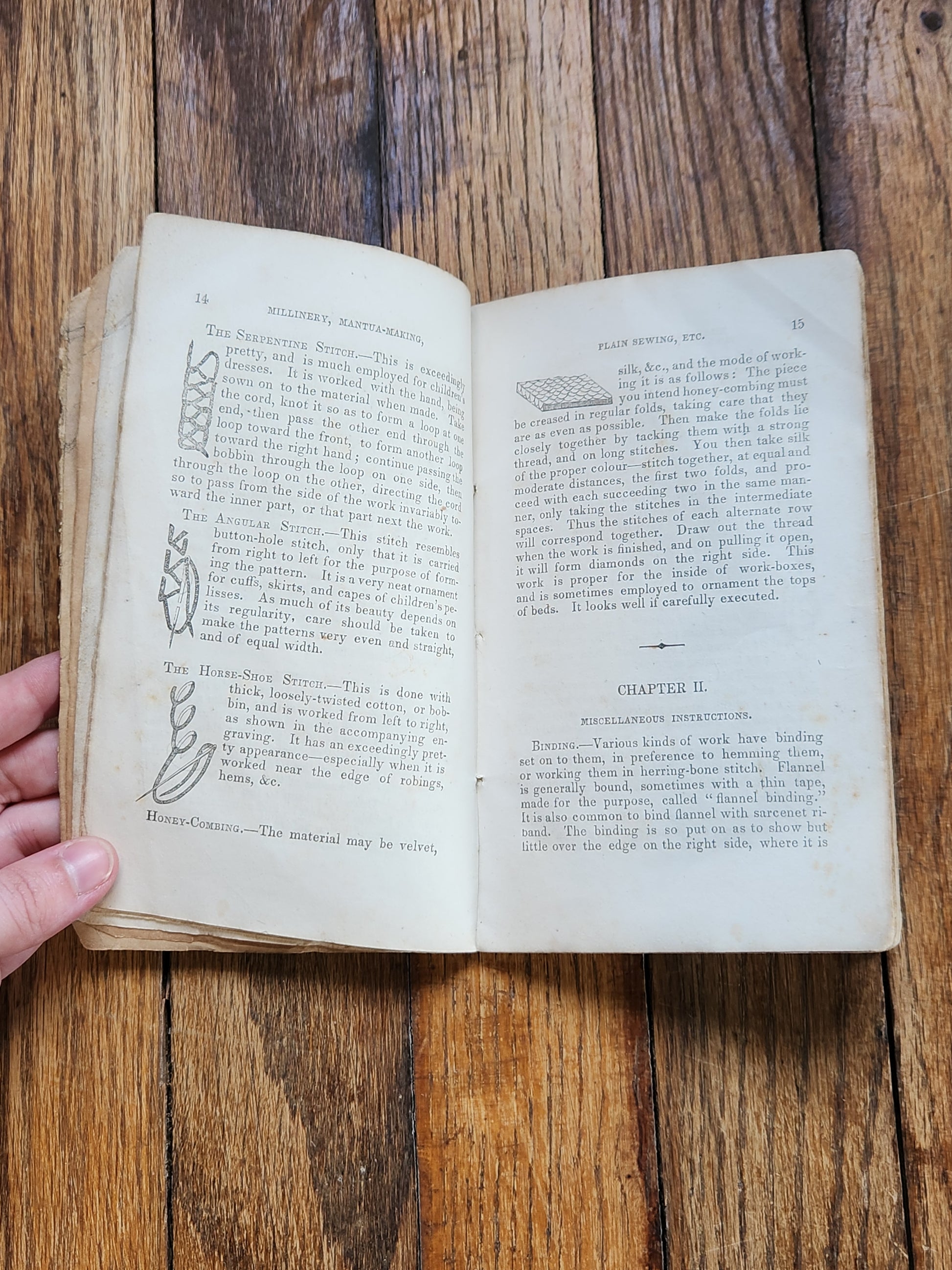 The book provides detailed instructions for hemming, felling, running, gathering, herring-boning, binding, marking, making buttons, and more. Includes 14 engraved illustrations demonstrating techniques.