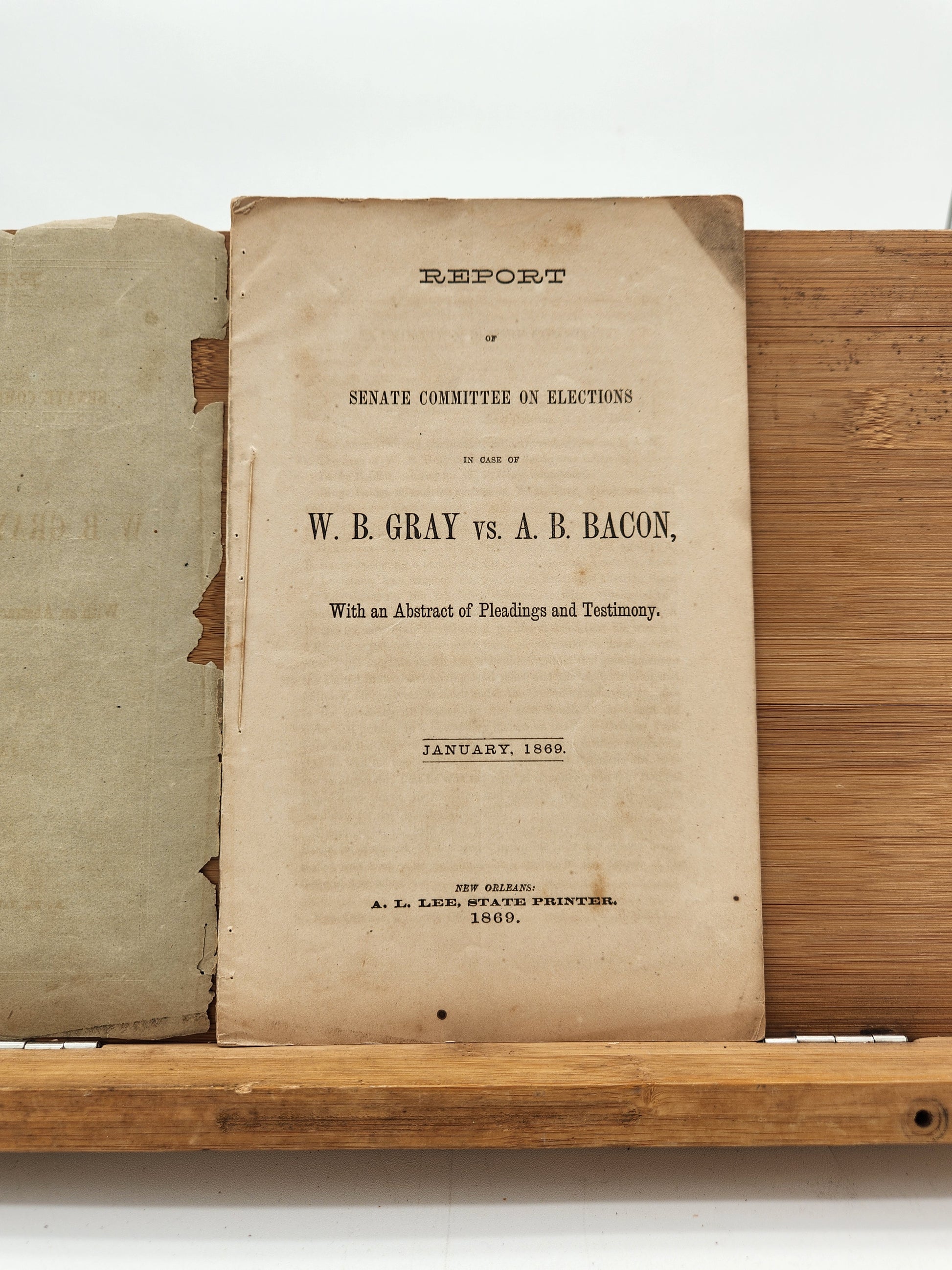 Original 1869 Louisiana government pamphlet titled Report of Senate Committee on Elections in Case of W. B. Gray vs. A. B. Bacon, with an Abstract of Pleadings and Testimony.