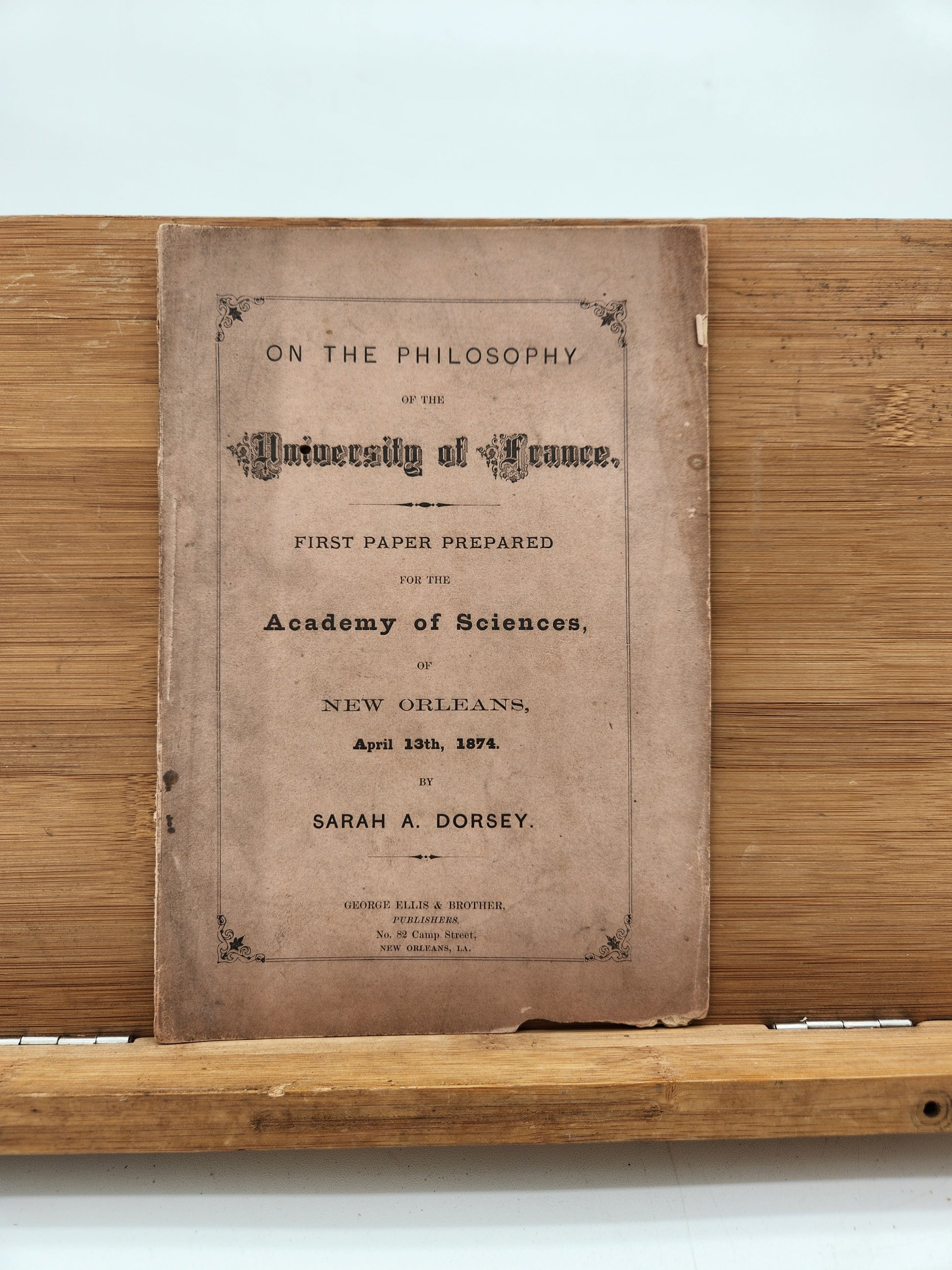Rare original 1874 pamphlet On the Philosophy of the University of France by Sarah A. Dorsey, printed by George Ellis & Brother, New Orleans. First paper prepared for the Academy of Sciences of New Orleans, April 13th, 1874. Dorsey was a noted Southern author and benefactor to Jefferson Davis. Original printed wraps, approx. 9” tall, 19th-century paper with age toning and minor edge wear. Exceptionally scarce Reconstruction-era Louisiana imprint by an early female scholar.