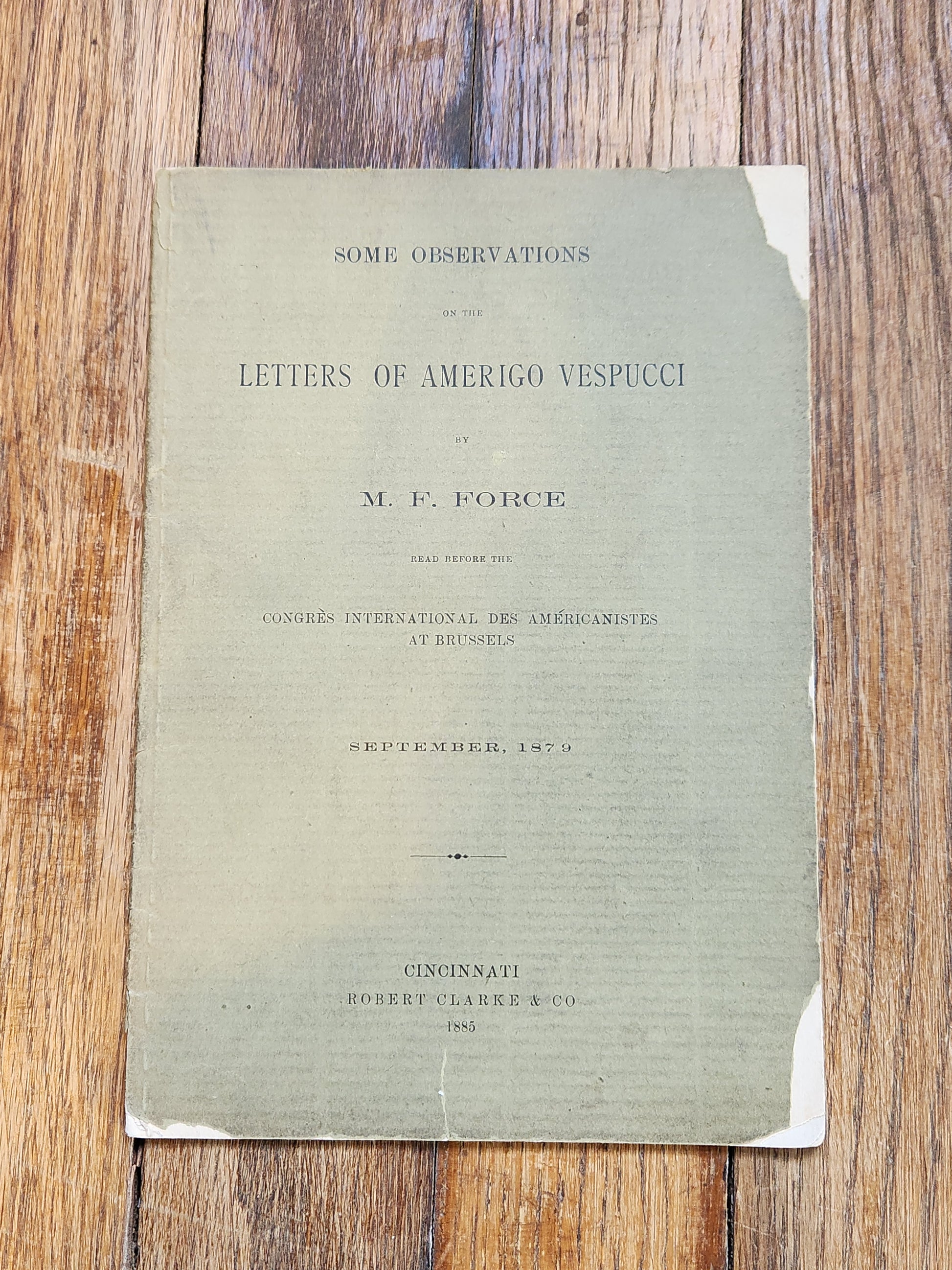 Offered here is an original 1885 printing of Some Observations on the Letters of Amerigo Vespucci by M.F. Force, published by Robert Clarke & Co. of Cincinnati. This scarce pamphlet was first read before the Congrès International des Américanistes in Brussels in 1879 and examines the authenticity and historical significance of Amerigo Vespucci’s correspondence and voyages.