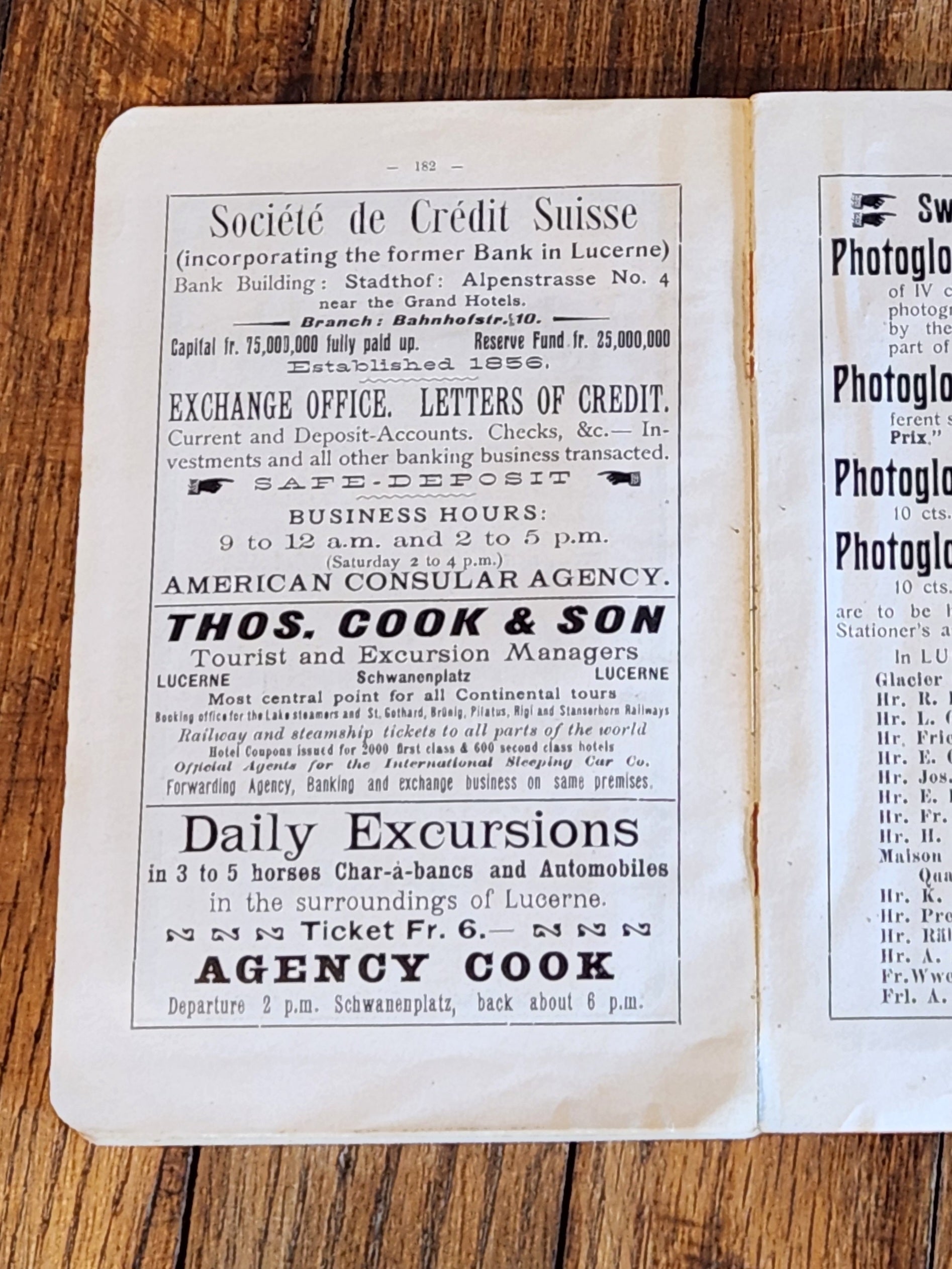 Local advertisements (Thomas Cook excursions, Société de Crédit Suisse, etc.)