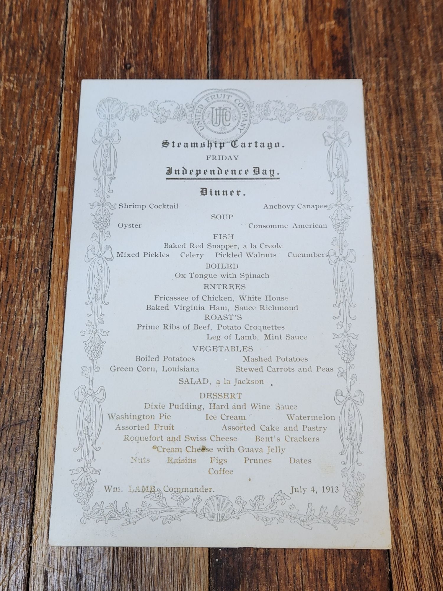 1913 United Fruit Company, Independence Day Dinner Menu