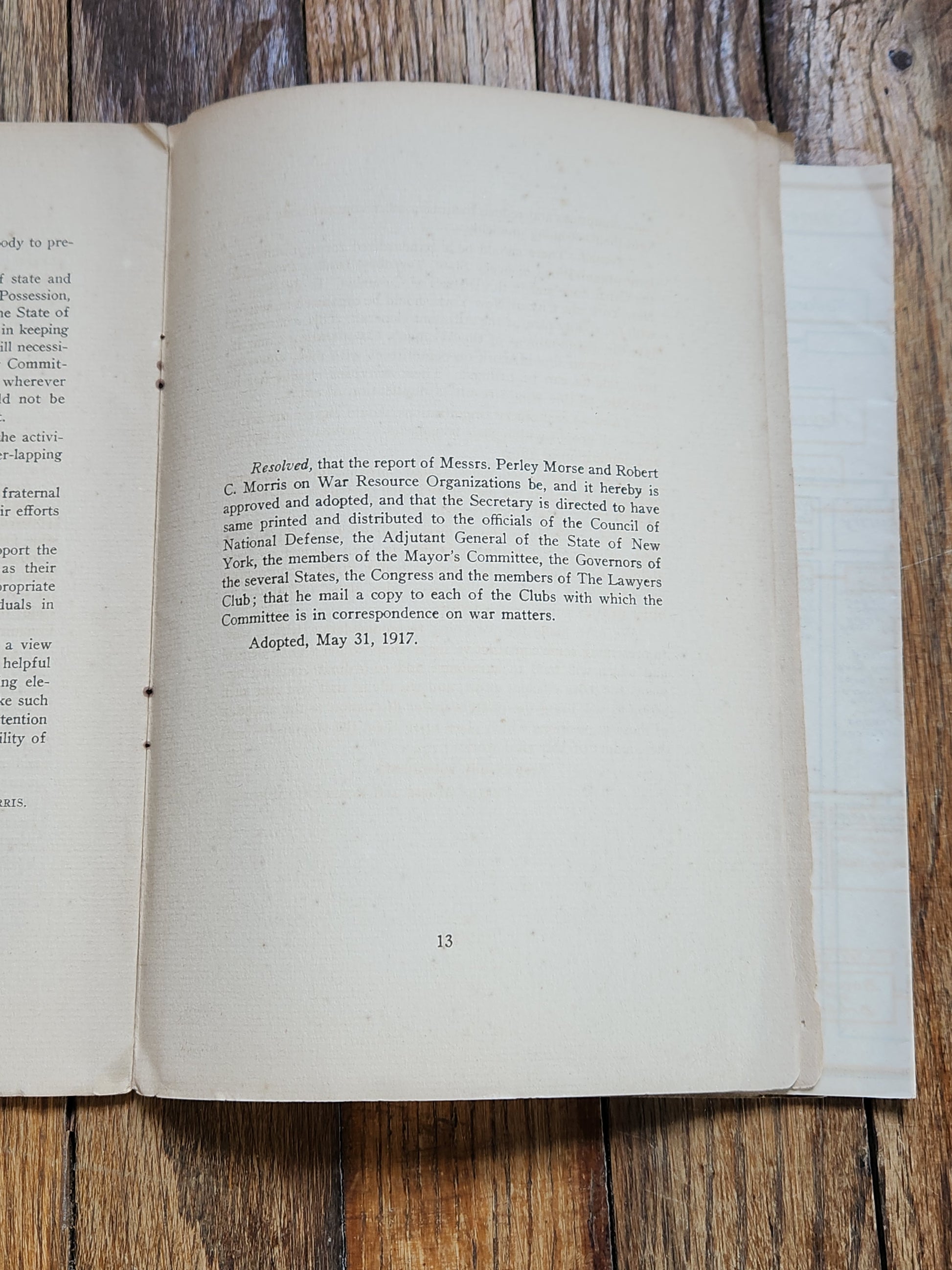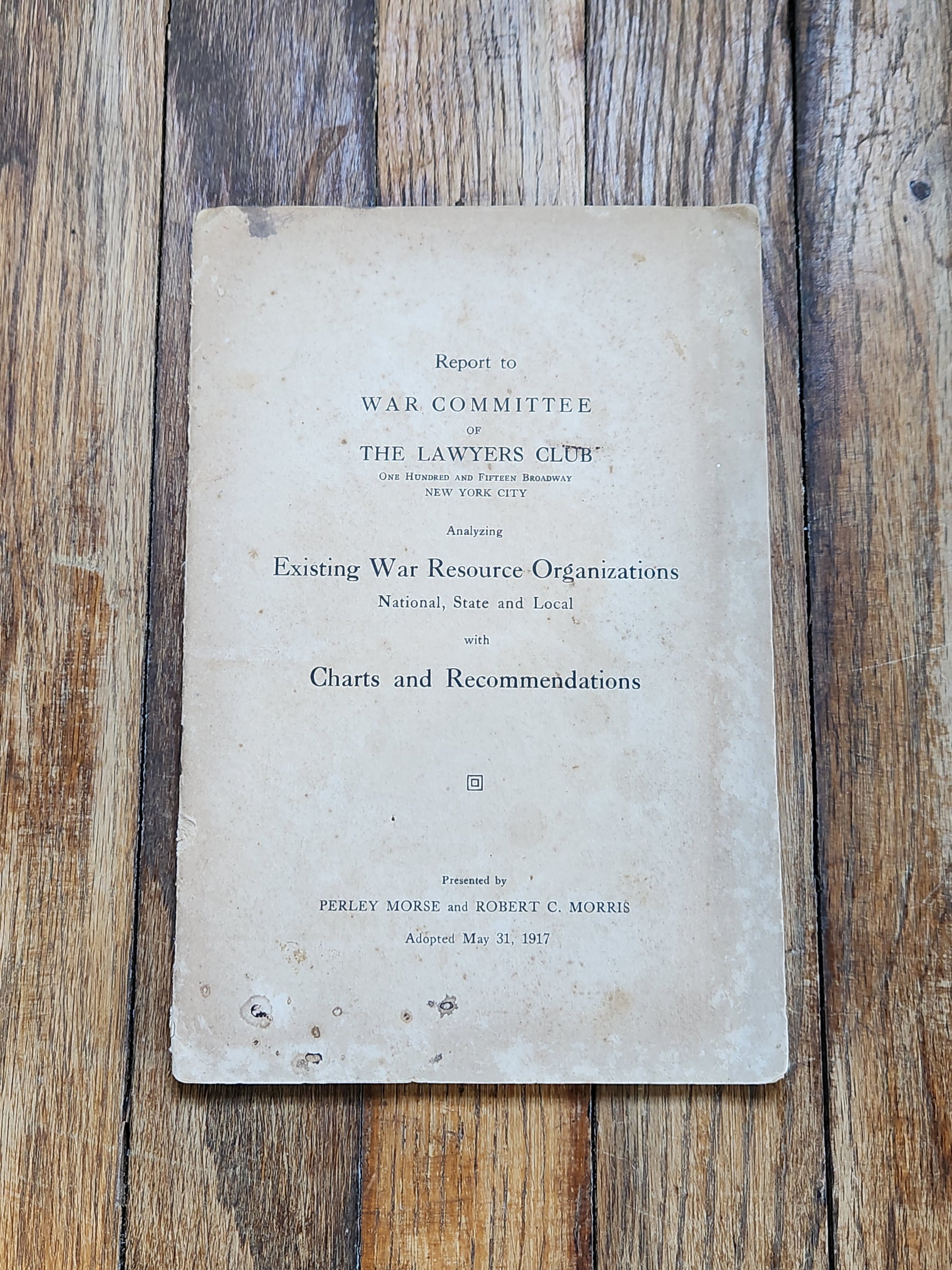 Original 1917 report booklet titled “Report to the War Committee of The Lawyers Club, New York City, Analyzing Existing War Resource Organizations — National, State and Local, with Charts and Recommendations.”