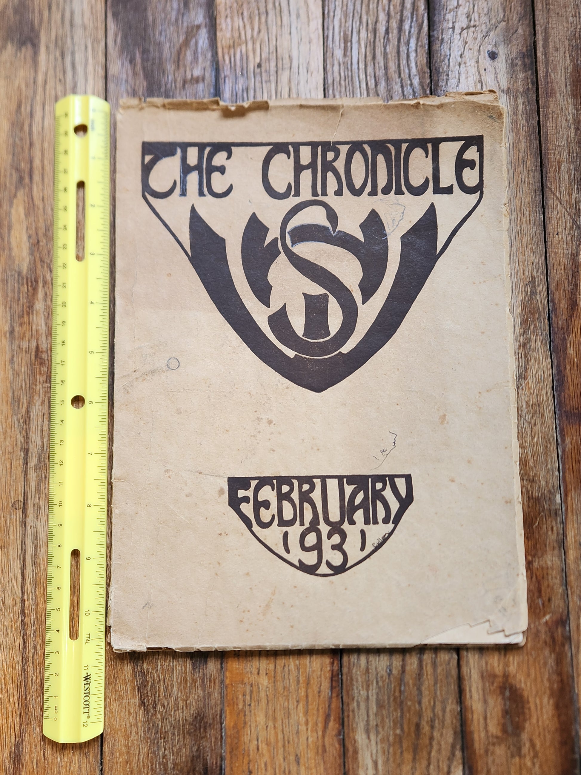 This is an original February 1931 edition of The Chronicle, the student publication of Warren Easton High School in New Orleans, Louisiana. This early yearbook-style chronicle includes photographs of the senior class officers, essays, humor columns, and vintage advertisements from historic New Orleans businesses such as Katz & Besthoff, Solari’s, Feibleman’s, and Eichling’s Avenue Floral Co.