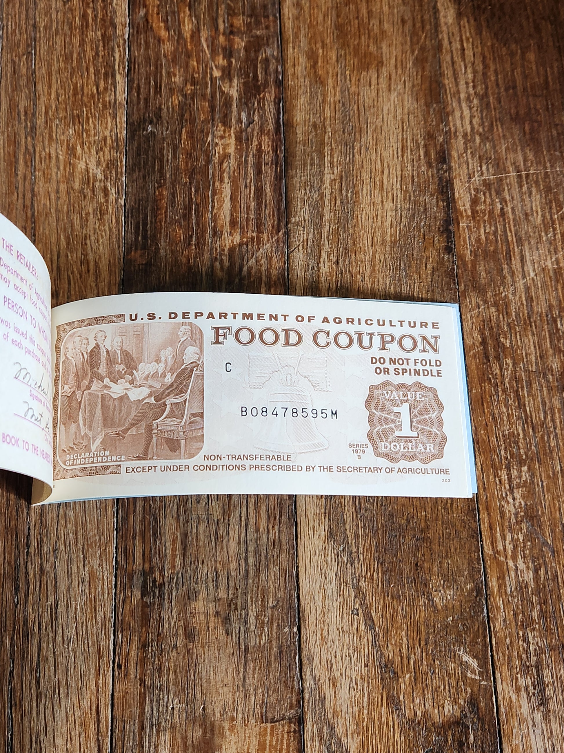 Offered here is an original 1979 U.S. Department of Agriculture Food Stamp coupon booklet, complete and unused, with a total face value of $7.00.