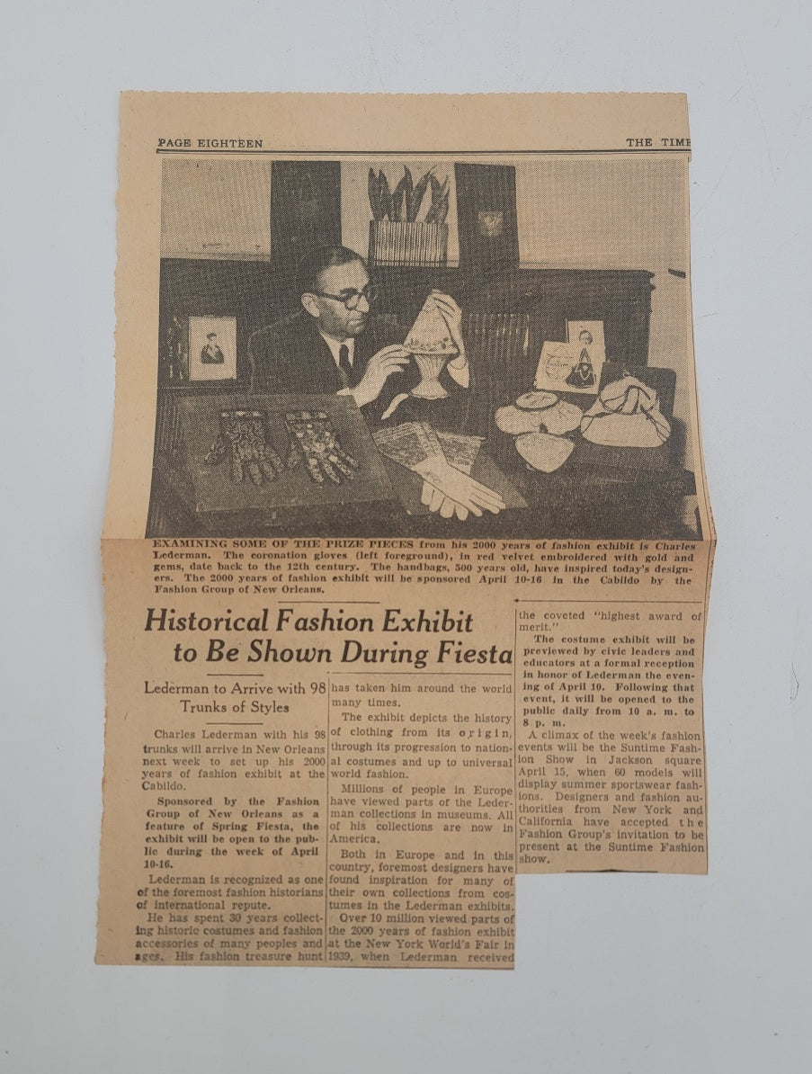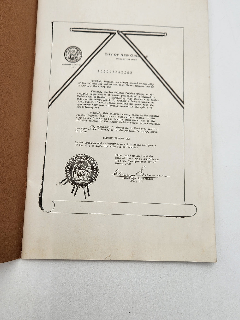 2000 Years of Fashion is a 32 page program from a 1950s historical fashion event that took place at the Cabildo. It was so important to the city of New Orleans that the mayor declared April 15th to be Sunshine Fashion Day in the city. There are two articles from the local paper that discuss the event. These are included with the purchase of the program.