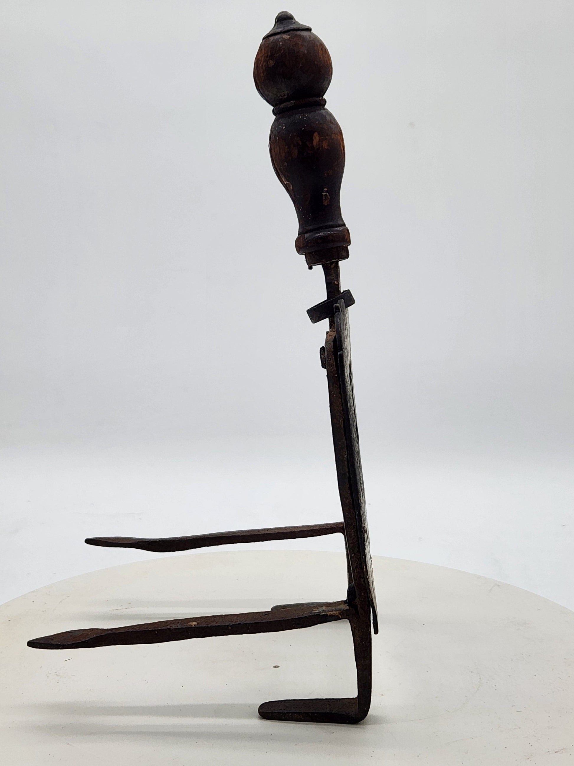 The handle is turned hardwood, aged beautifully with a warm patina and signs of long use. The ironwork shows the expected hammer marks and surface wear consistent with 19th–early 20th century blacksmith work.