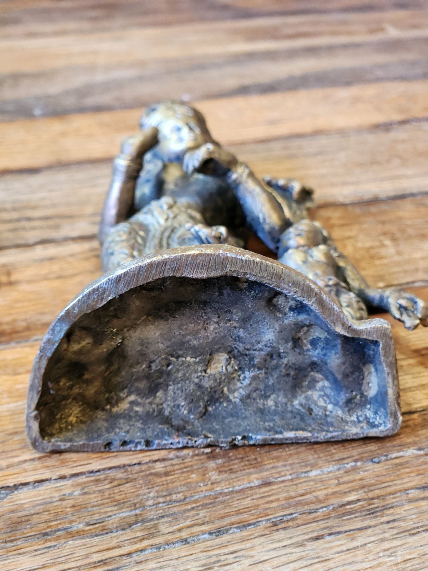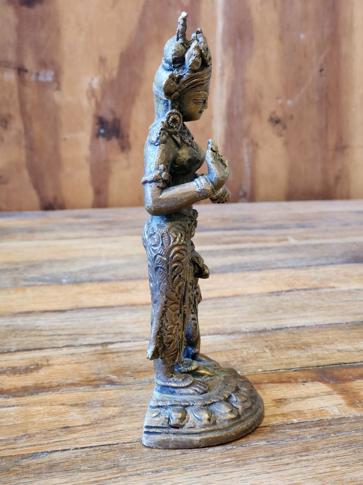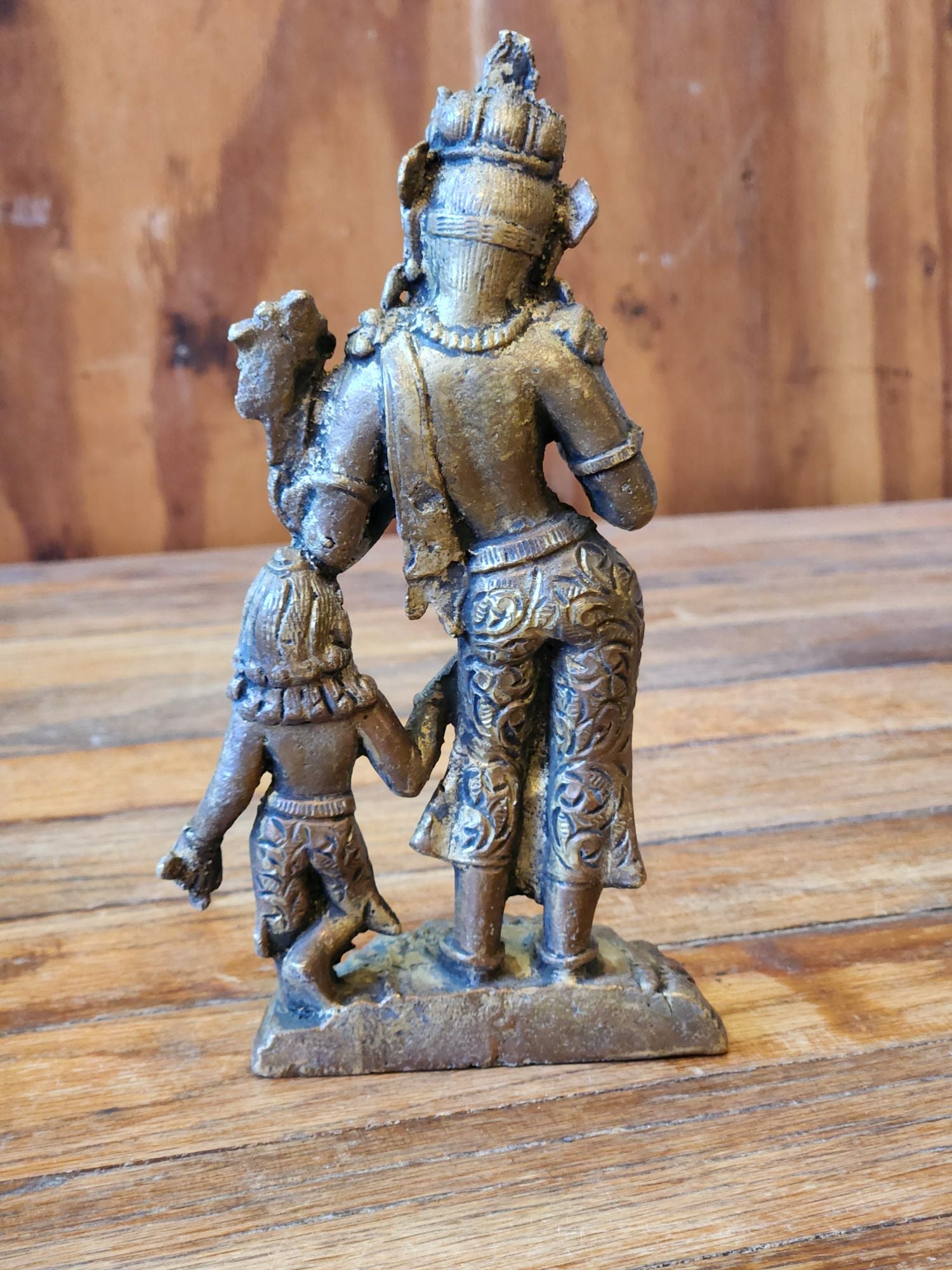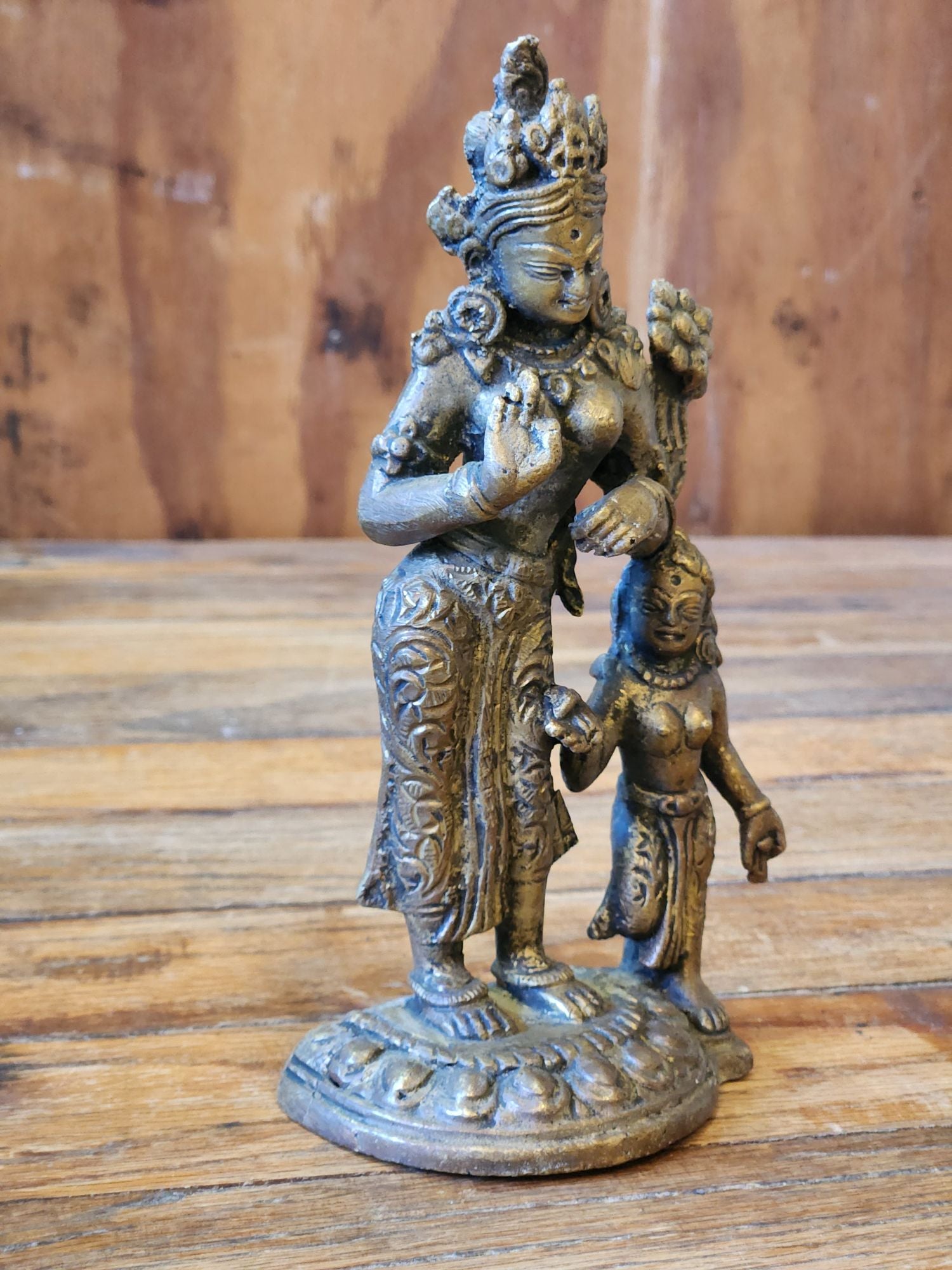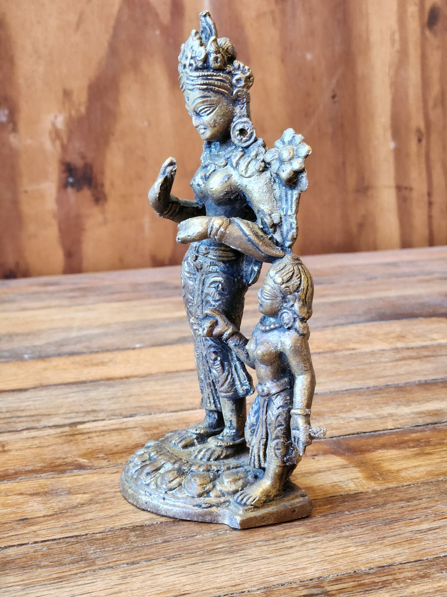 A beautiful antique cast hindu bronze of devi with child. the figure measures 7.00" high and is undamaged with a lovely patina.