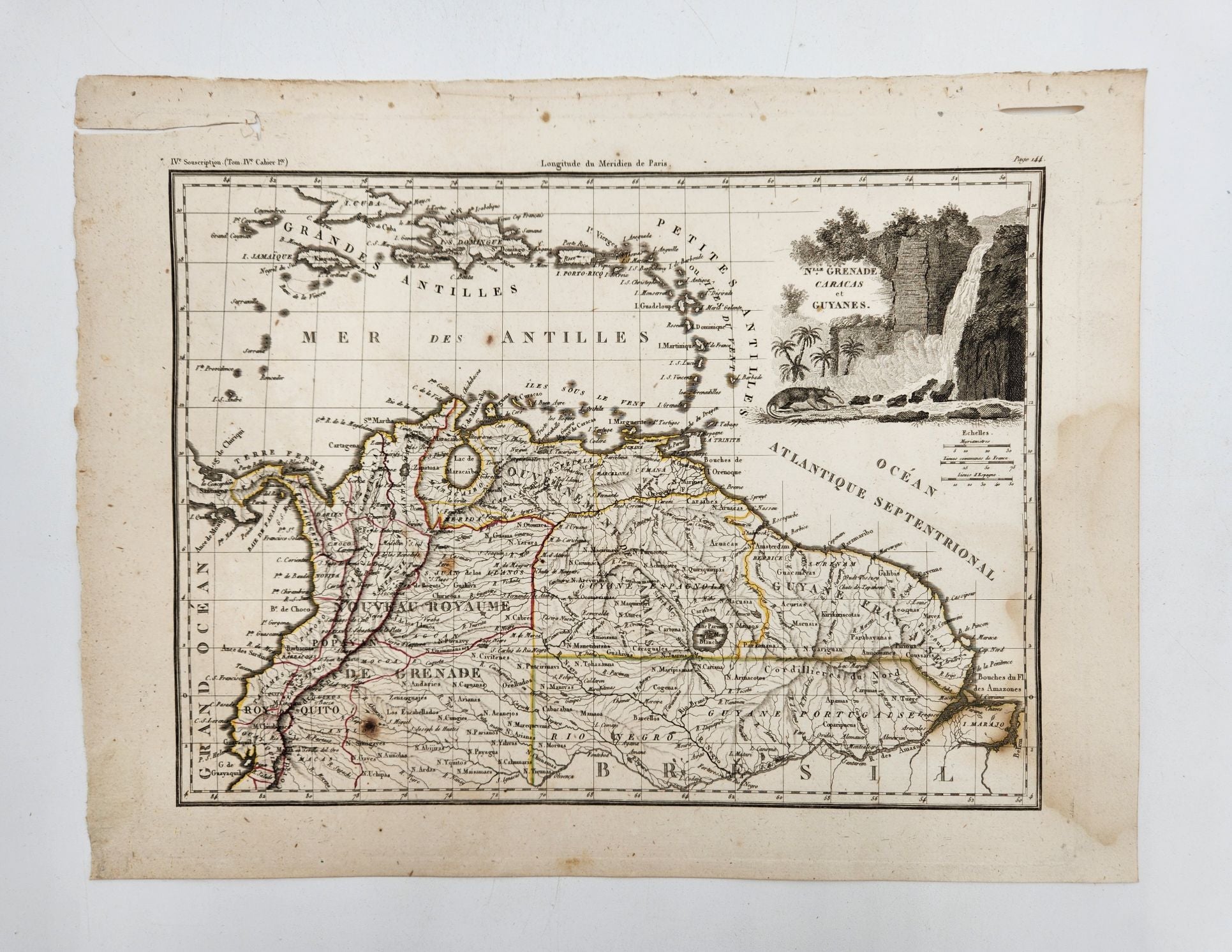 Antique hand colored map of Grenade Caracas et Guyanes from the Atlas Complet du Precis de la Geographie Universelle de M. Malte-Brun, by Lapie, 1812. Colored by region and featuring a decorative cartouche. Good antique condition. See photos. Page size is approximately 14.25 x 11 inches.