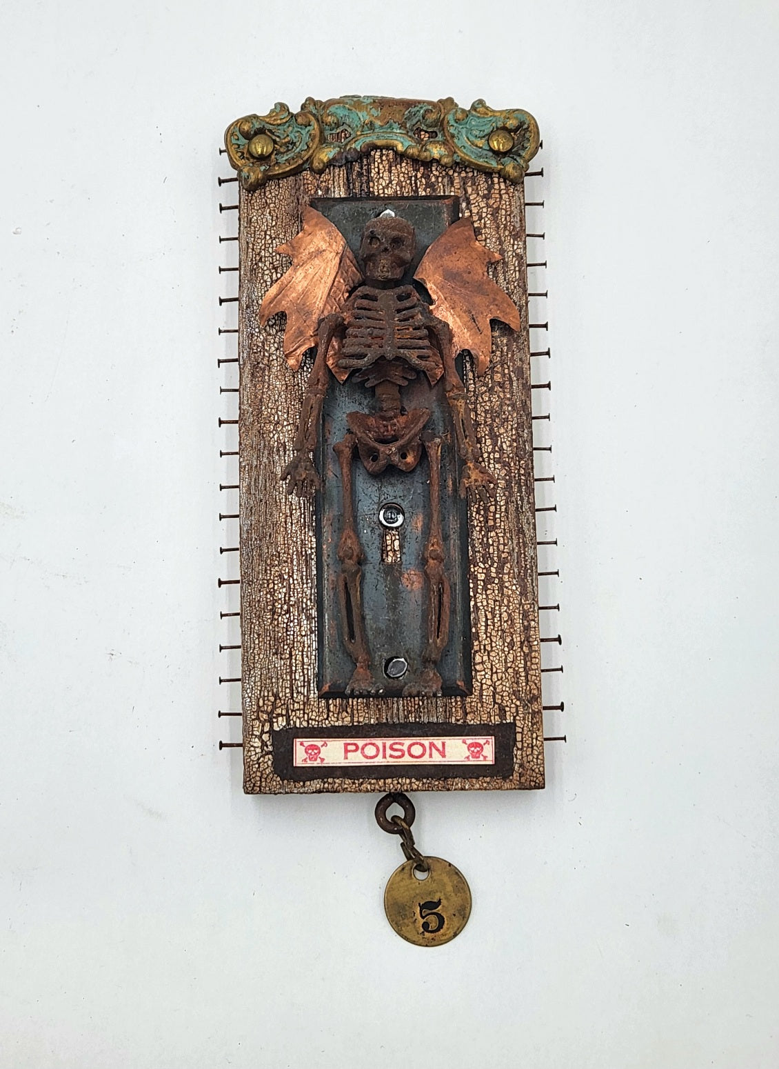 Assemblage art skeleton angel on gold board. 9" High x 4" Wide.