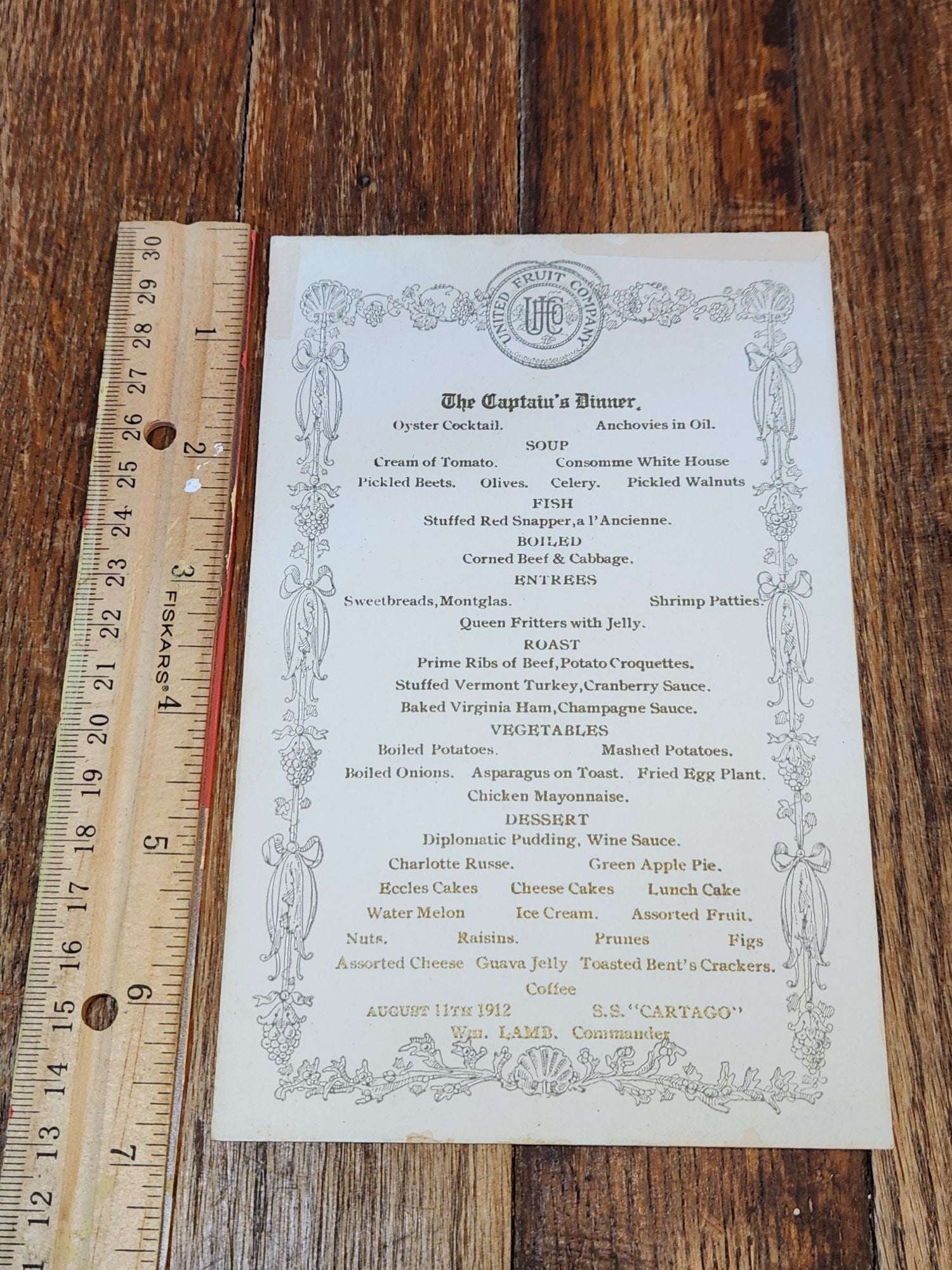 Aug. 11th 1912 United Fruit Company, The Captain's Dinner Menu