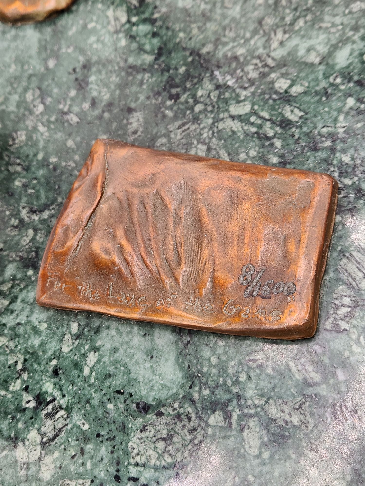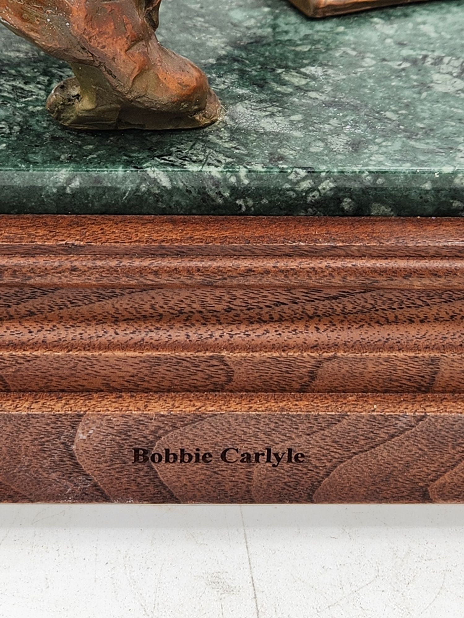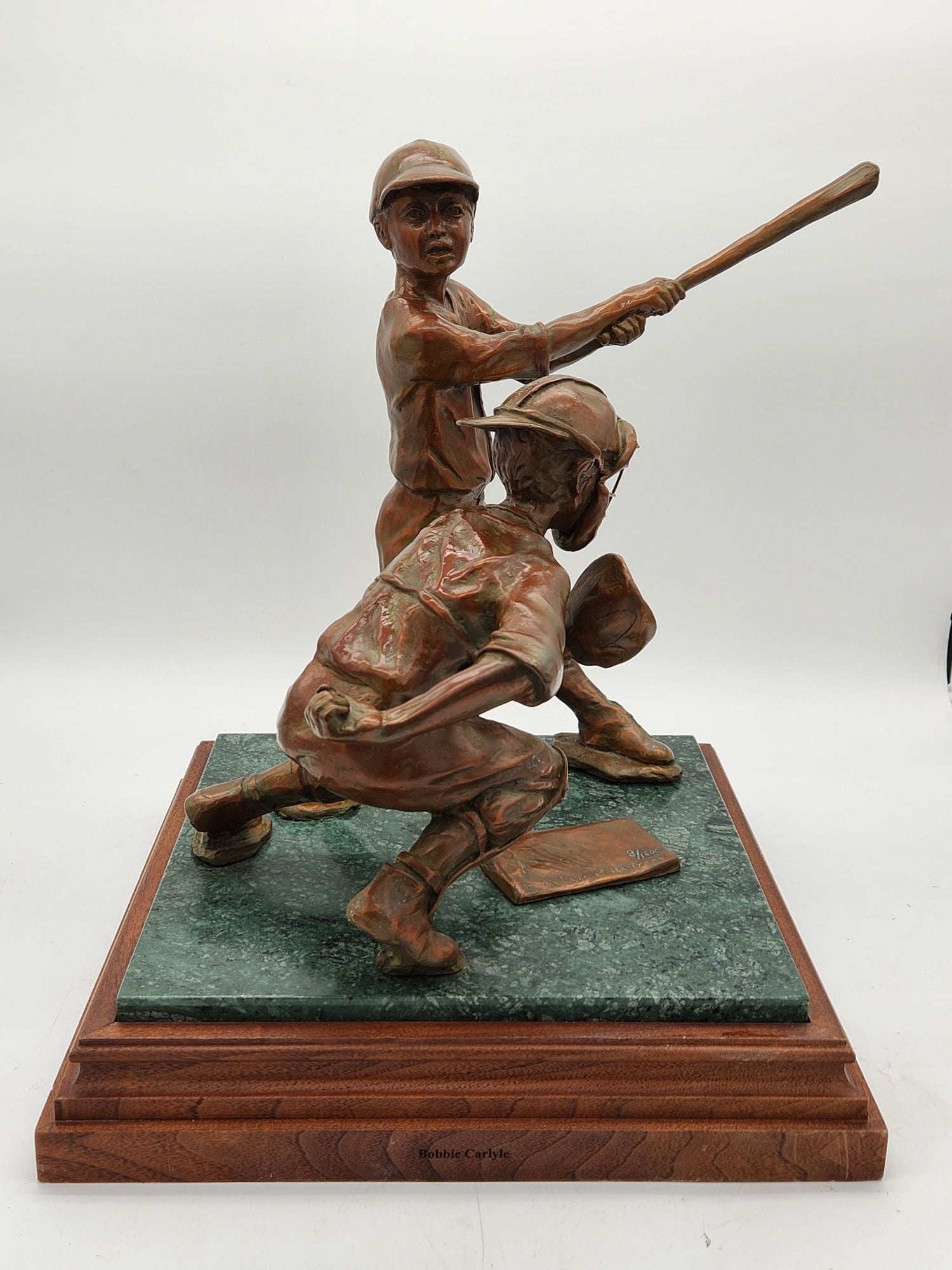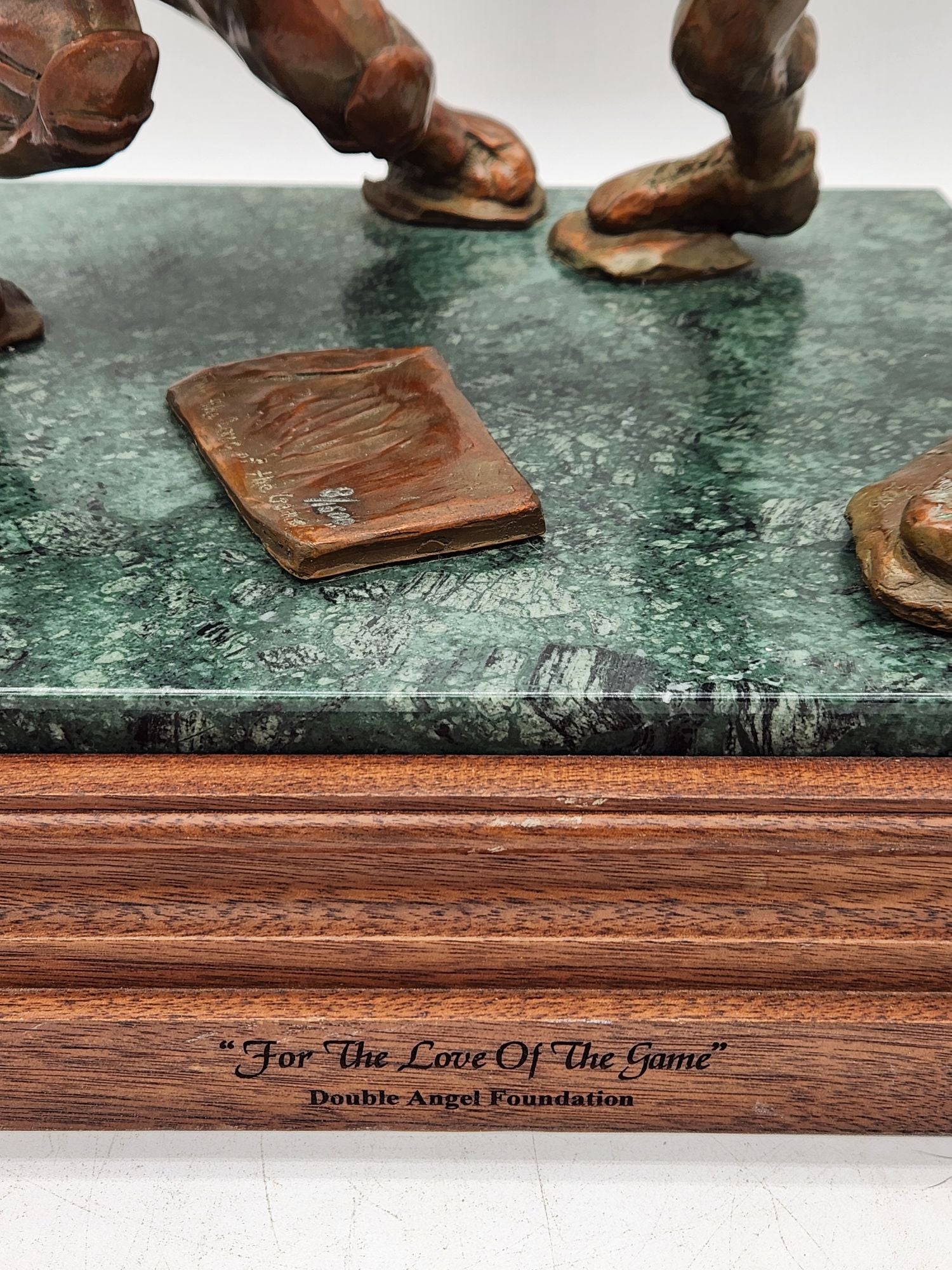 This is a bronze statue by Bobbie Carlyle titled For the Love of the Game. It was created for the Double Angel Foundation. It's 8/1600. It's about 19 inches high. The base is 15" x 15" and weighs 46 pounds.