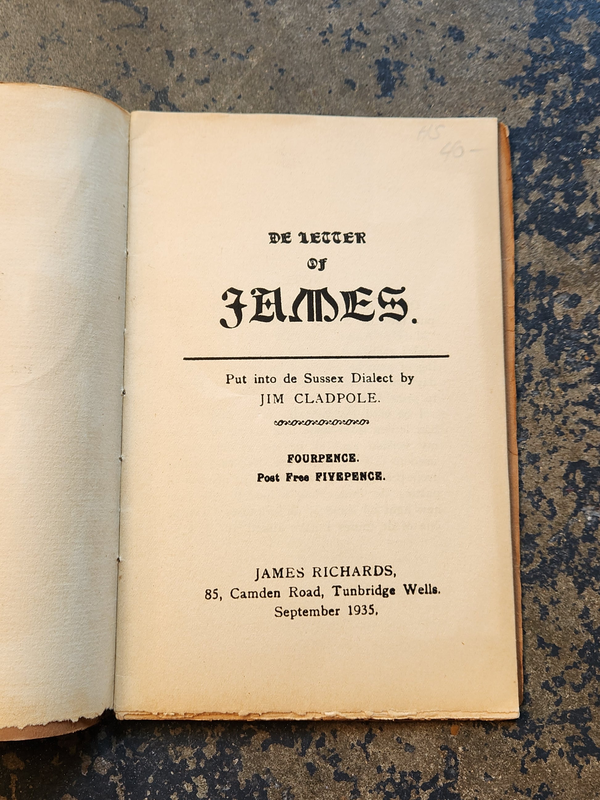 Scarce 1935 pamphlet titled De Letter of James, translated into the Sussex dialect by Jim Cladpole and published by James Richards, 85 Camden Road, Tunbridge Wells.