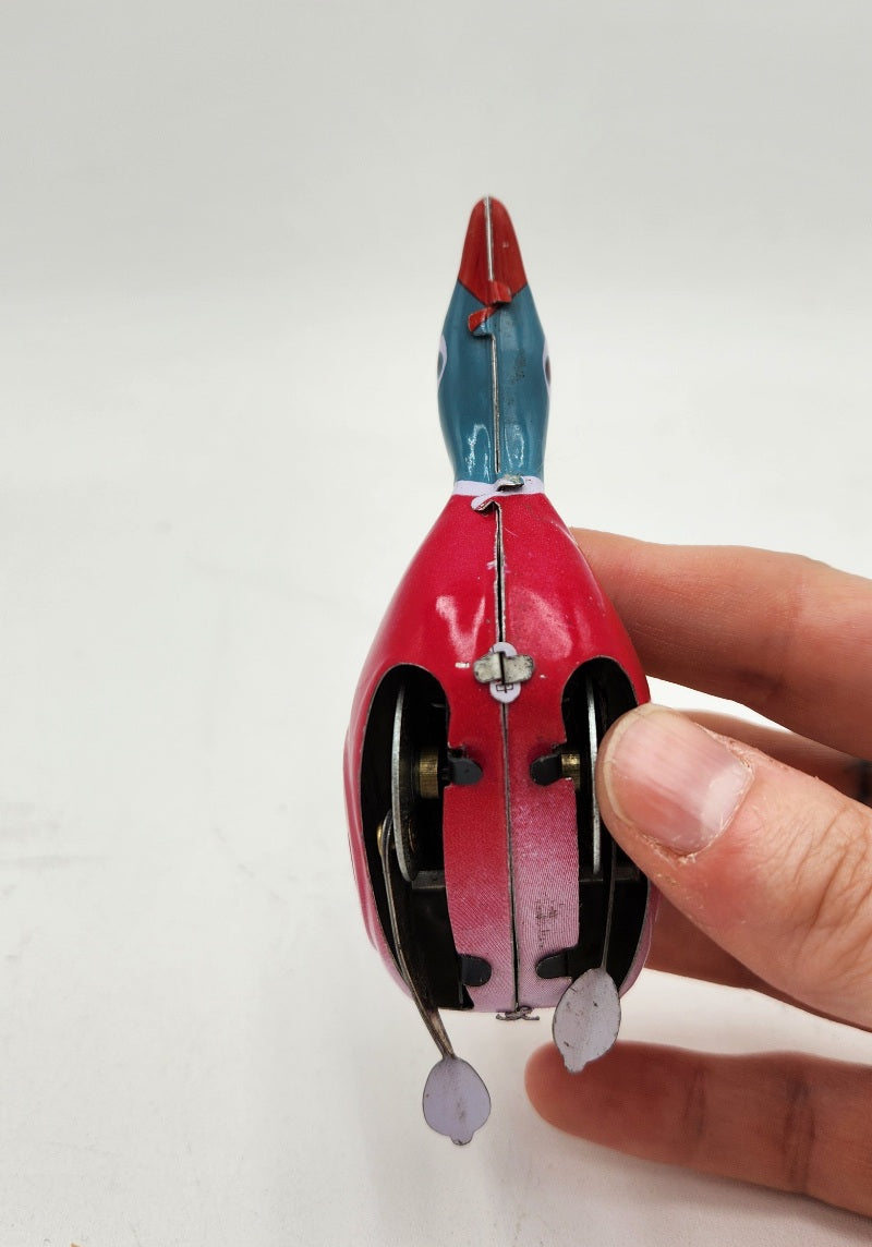 Rolling, wind-up duck tin toy. Blue, red, pink, and yellow. Missing wind-up key.