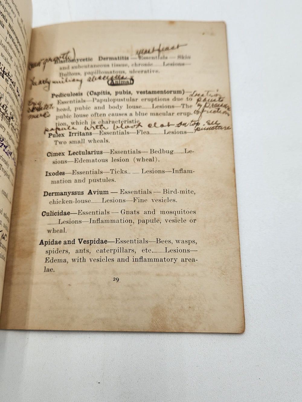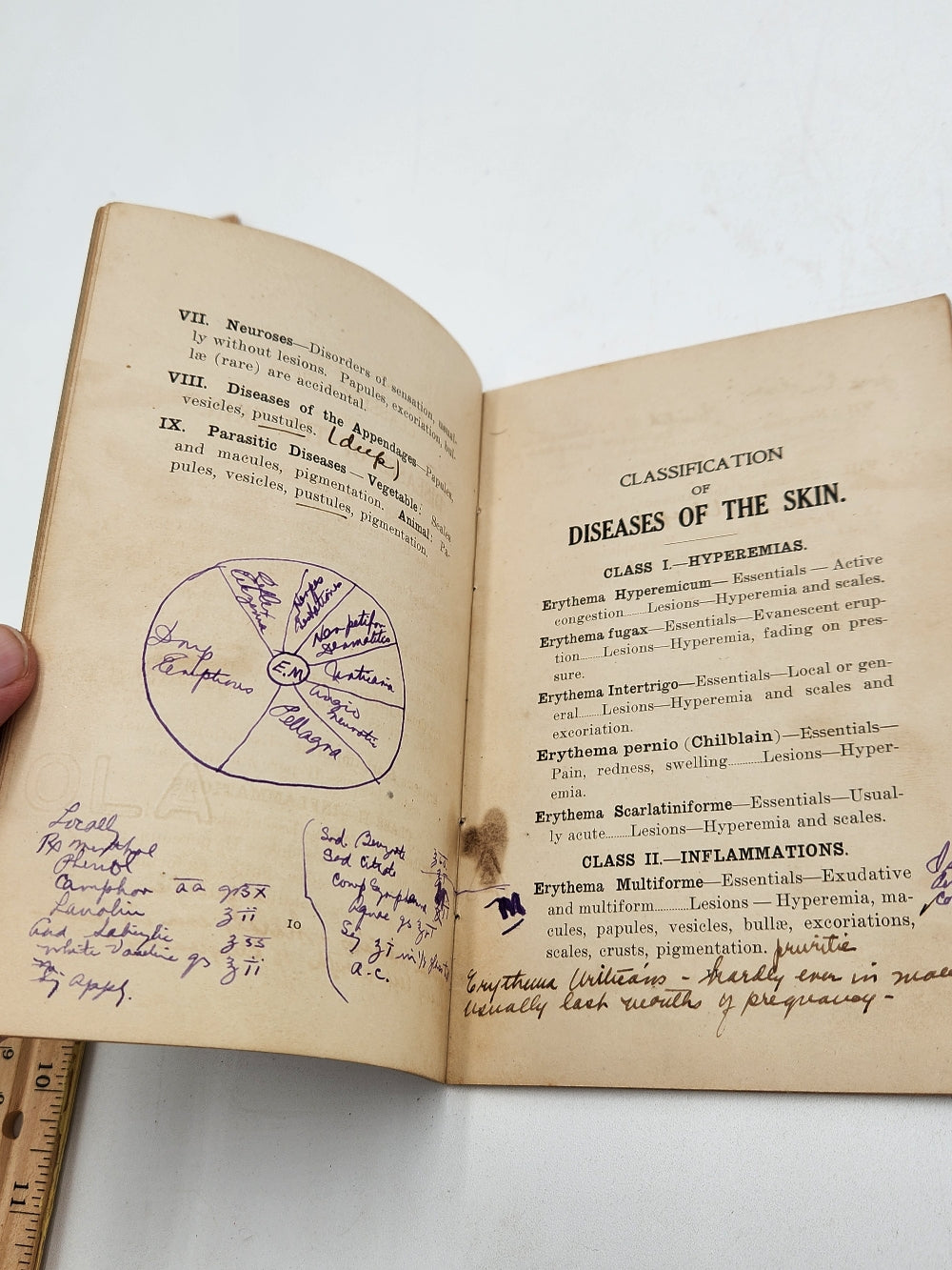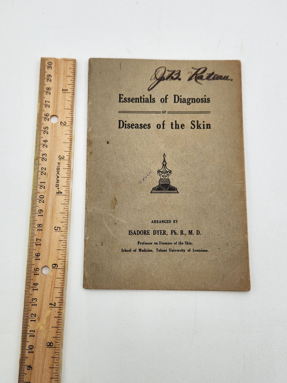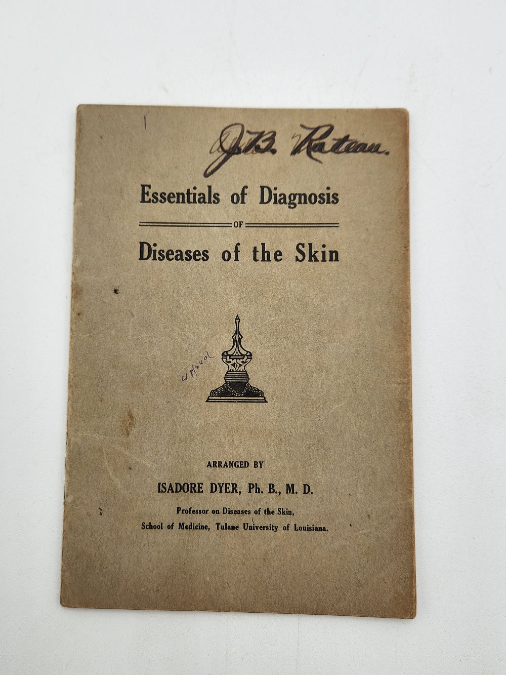 Essentials of Diagnosis of Diseases of the Skin by Isadore Dyer PHD School of Medicine at Tulane University. Notes are written throughout the 32 page book. This is New Orleans Doctor Jules B. Rateau's copy as a young medical student, with his ownership inscription at head of cover wrap, with annotations throughout. It's in really good condition for it's age (see photos).