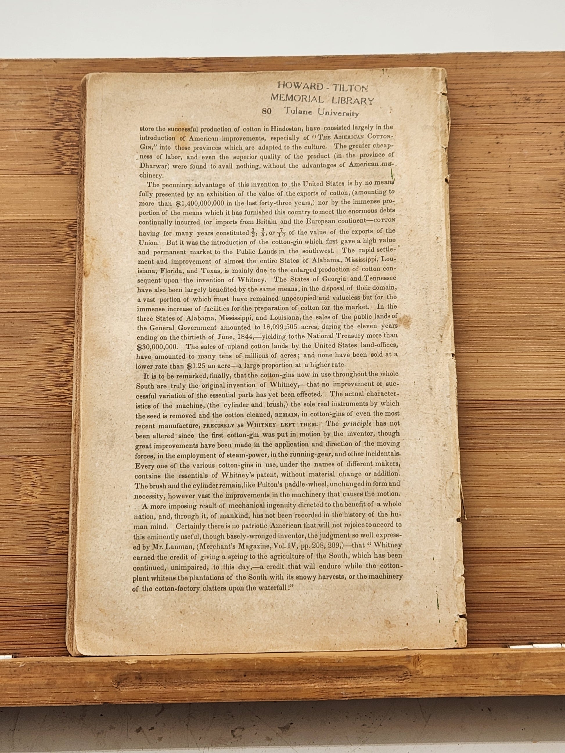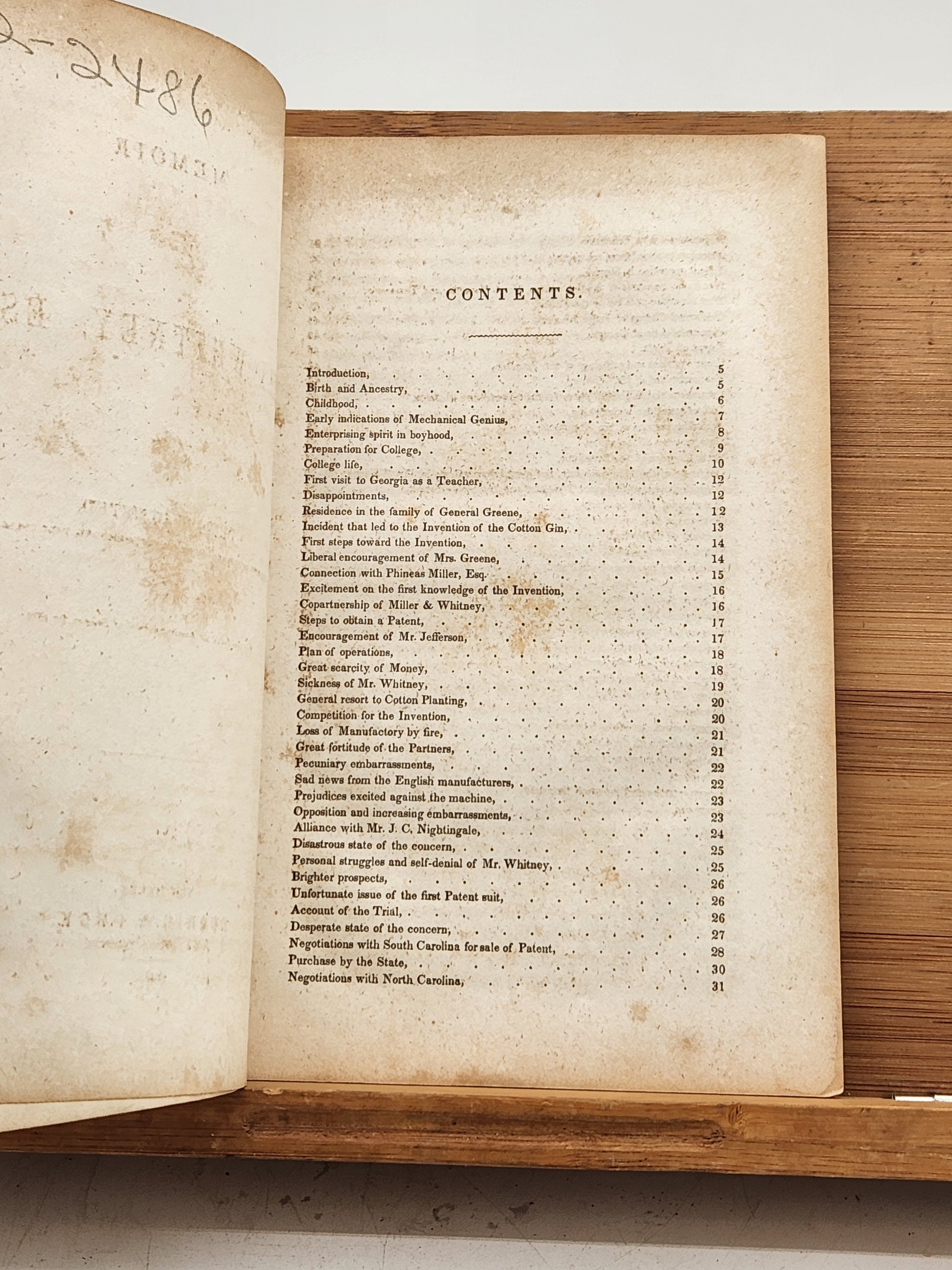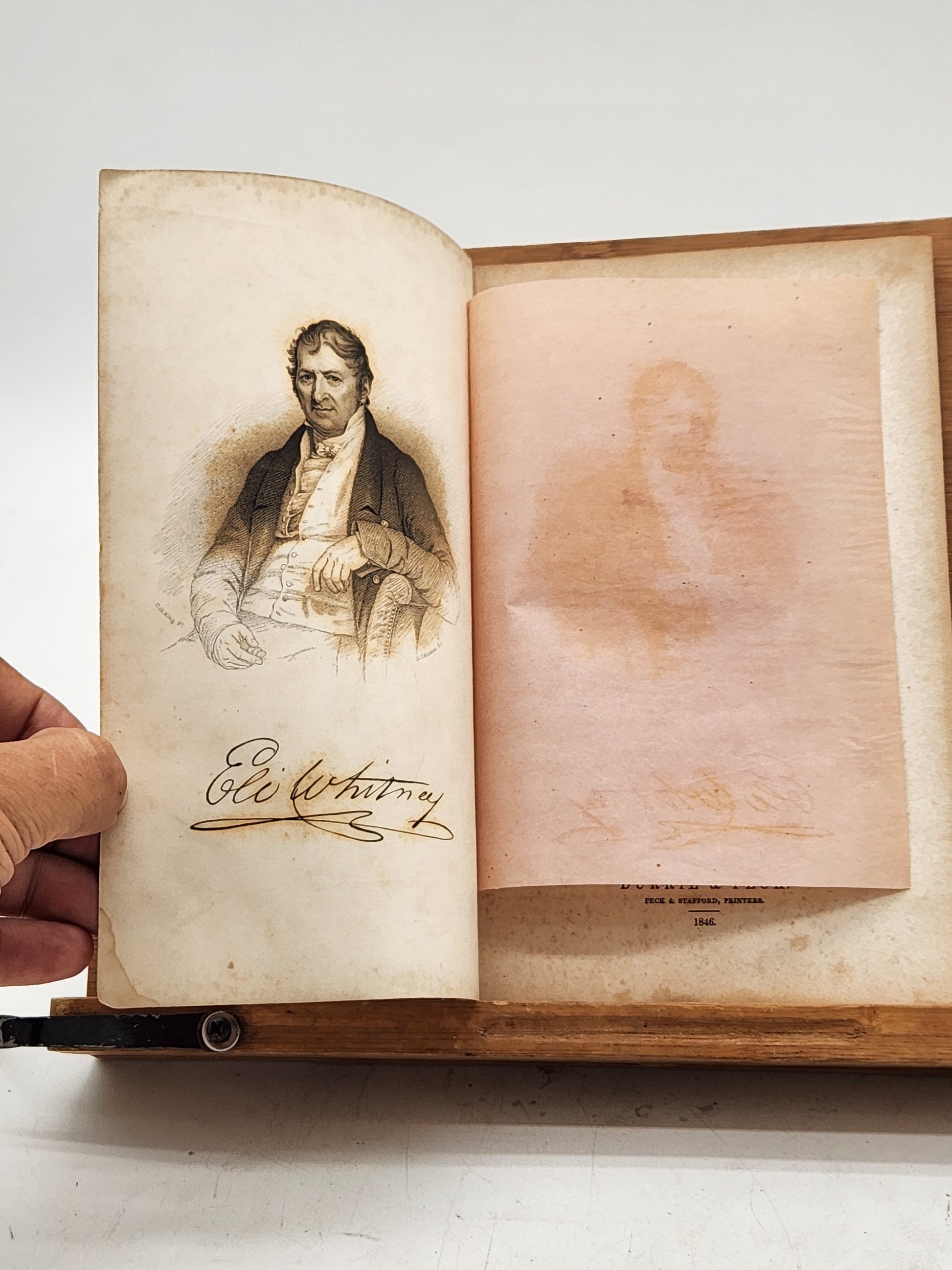 This is a first edition of 'Memoir of Eli Whitney, Esq.' by Denison Olmsted, published in 1846 by Durrie & Peck in New Haven. Eli Whitney was a pivotal figure in American industrial history, best known for inventing the cotton gin in 1793, which revolutionized the cotton industry. His later work focused on the development of mass production techniques, particularly in the manufacturing of firearms.