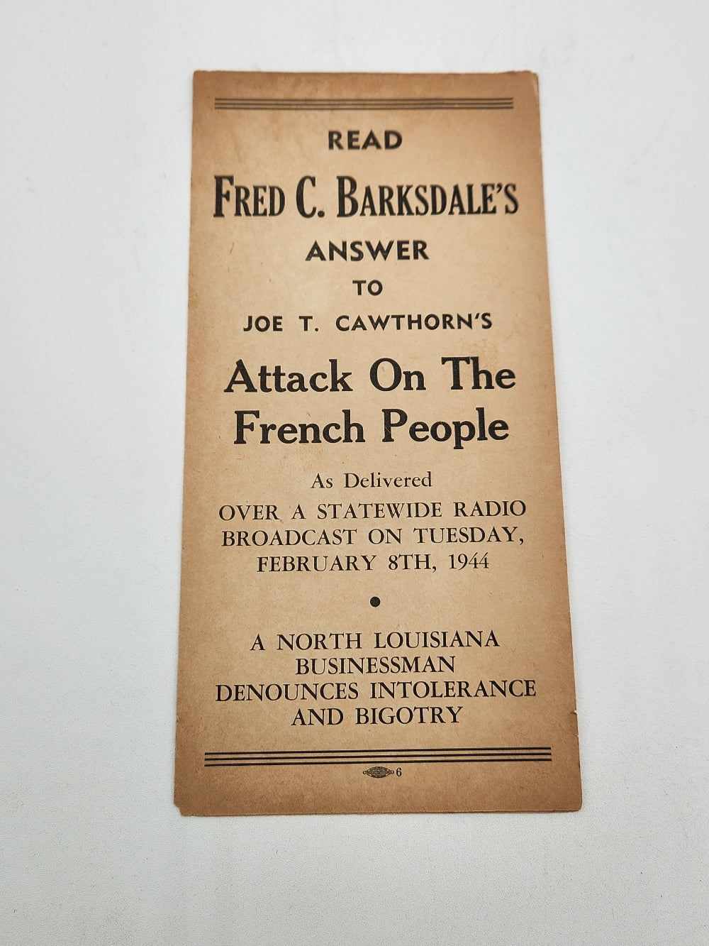 Fred C. Barksdale's Answer to Joe T. Cawthorn's Attack on the French People 1944 Speech Over Statewide Louisiana Radio