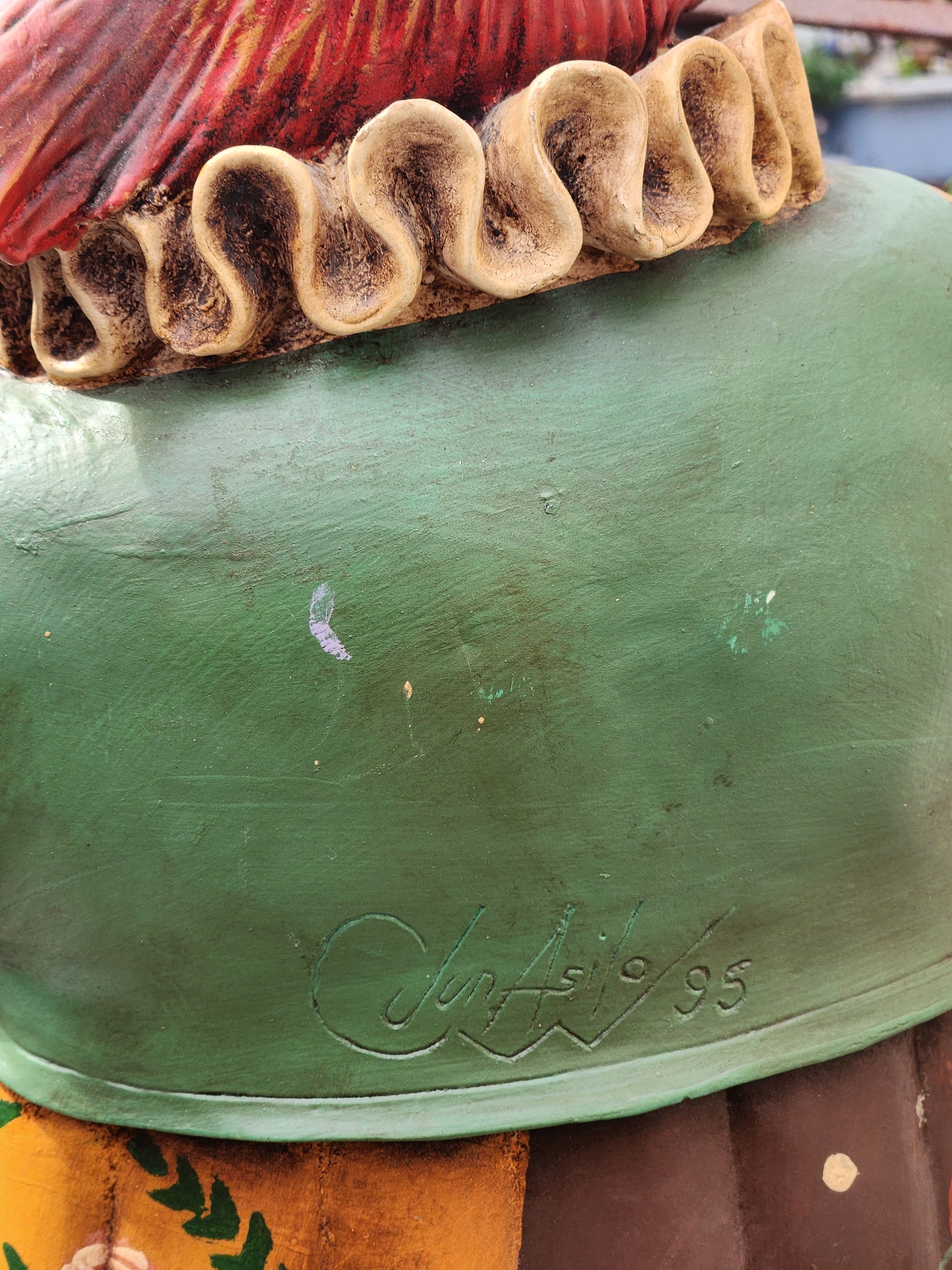 This vintage 1995 sculpture by artist Jun Asilo features a large-scale clown holding a dog, finished with hand-painted floral and harlequin patterns. The piece is constructed from a heavy resin or fiberglass material and stands approximately 21 inches tall. It is signed and dated by the artist on the back of the green vest. The item is in vintage condition with original paint, showing only minor surface wear and small paint flakes consistent with its age. Please refer to the photos to evaluate the specific condition of the finish and the artist's signature.