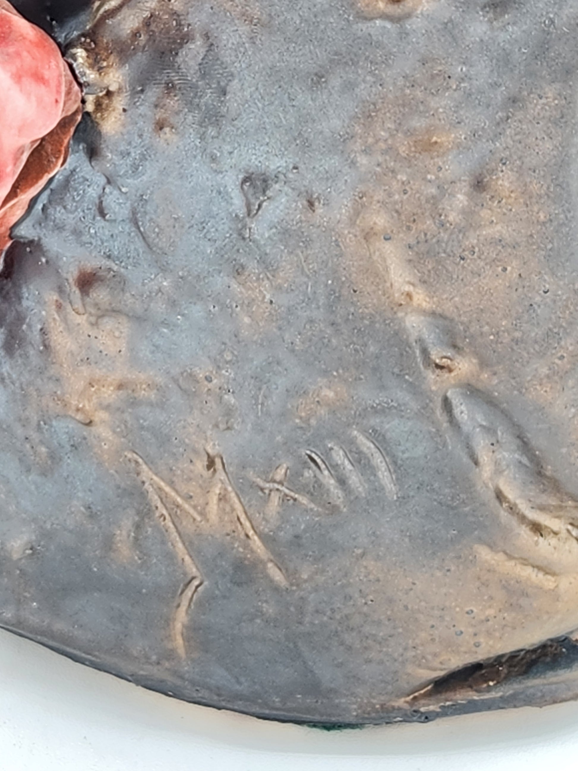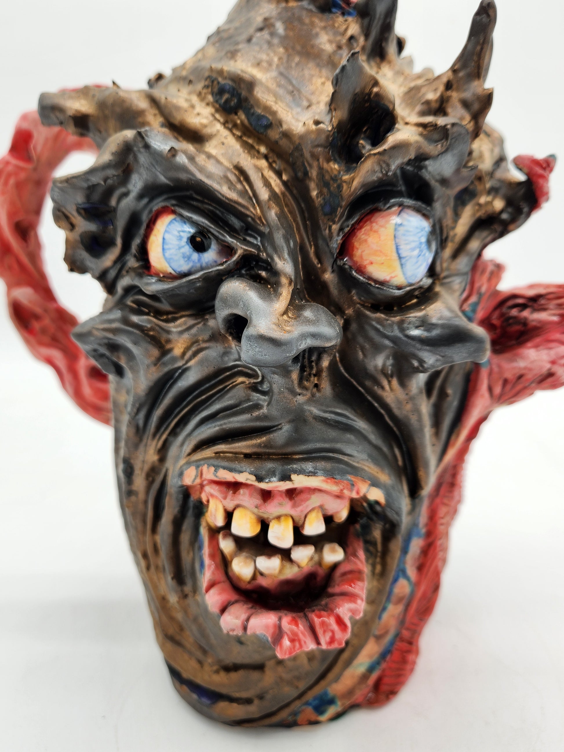 This extraordinary hand-sculpted face jug is a contemporary work of art pottery signed Mxiii. Meticulously crafted from glazed ceramic, it features two expressive demonic faces fused together, each with wildly exaggerated eyes, snarling mouths, and gruesomely detailed teeth. The artist has captured the tension of duality — rage and torment — through expert anatomical modeling and layered glaze work.