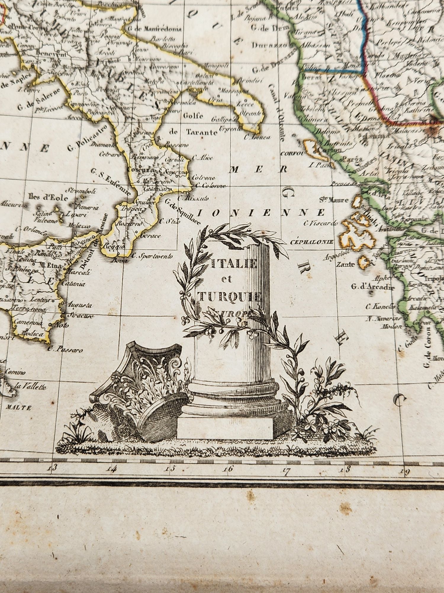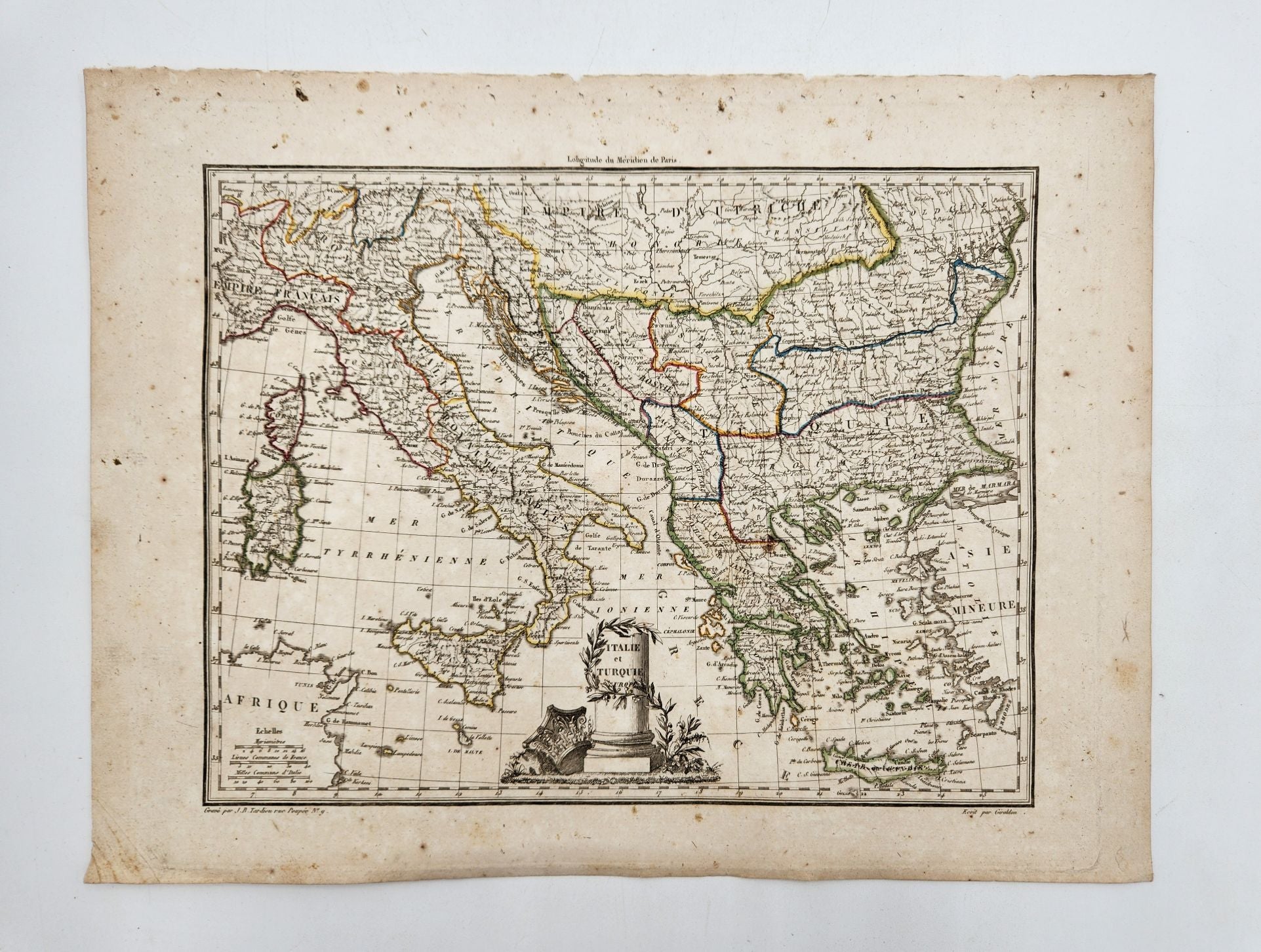 Antique hand colored map of Italy, Italia E Turchia from the Atlas Complet du Precis de la Geographie Universelle de M. Malte-Brun, by Lapie, 1812. Colored by region and featuring a decorative cartouche. Good antique condition. See photos. Approx. 14.25 x 11 inches.