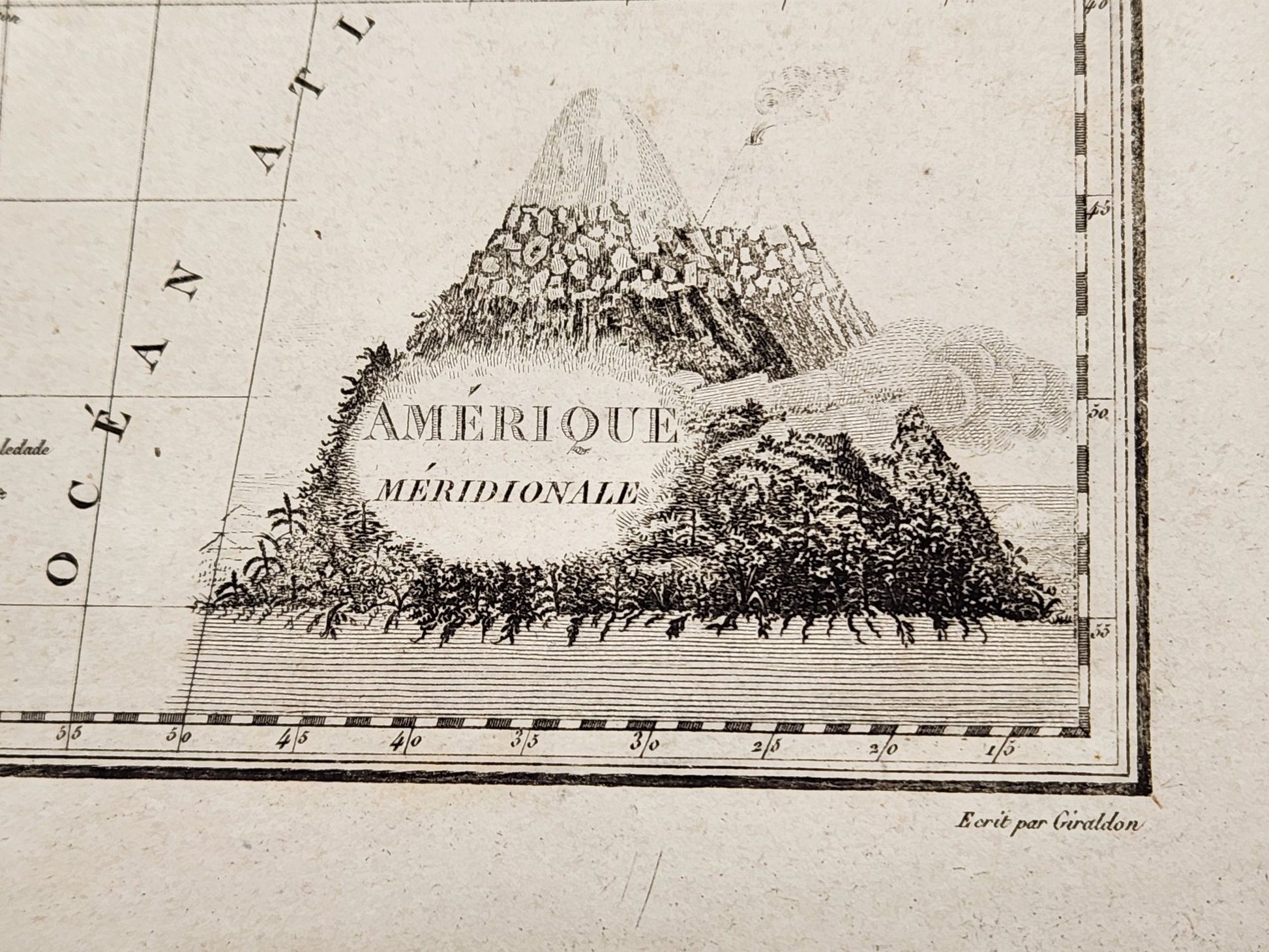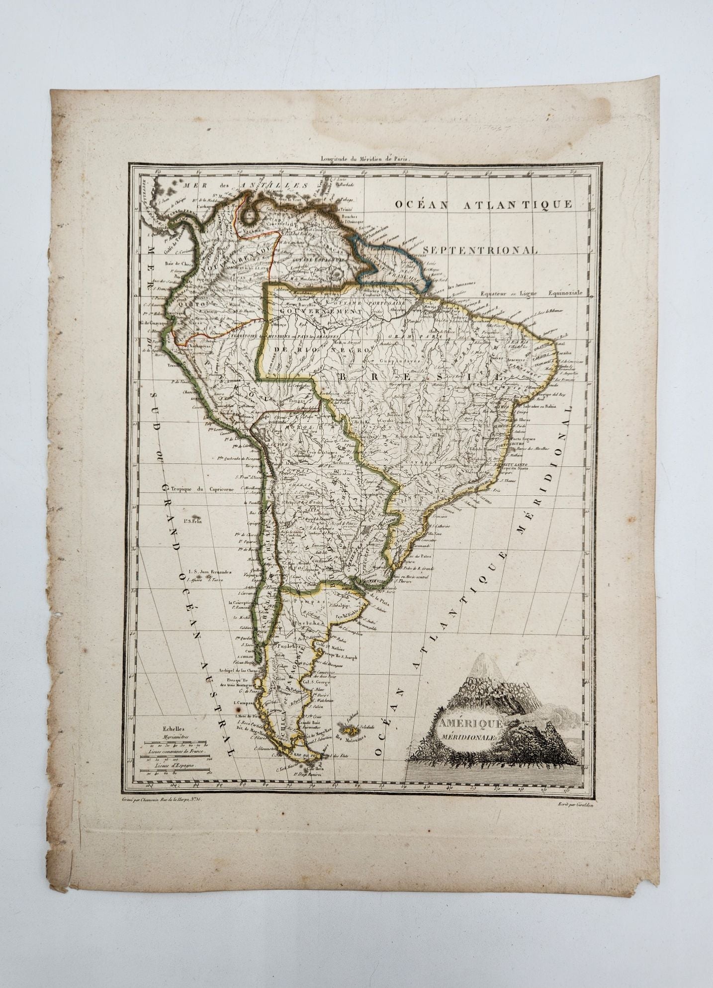 Antique hand colored map of South America from the Atlas Complet du Precis de la Geographie Universelle de M. Malte-Brun, by Lapie, 1812. Colored by region and featuring a decorative cartouche. Good antique condition. See photos. Approx. 14.25 x 11 inches.