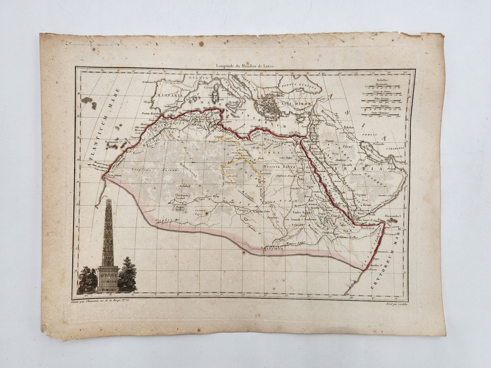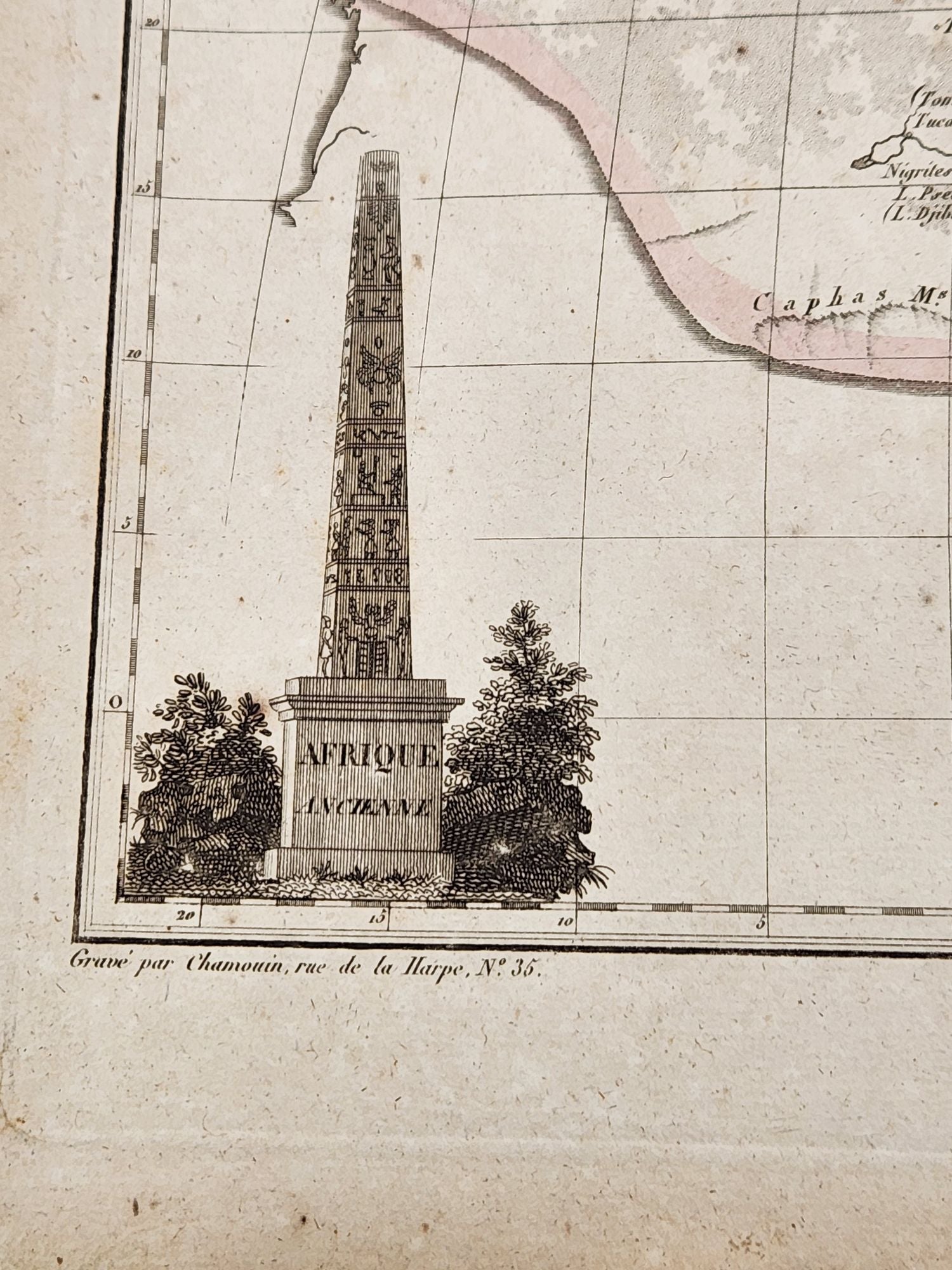 Antique hand colored map of Afrique Ancienne - Ancient Africa from the Atlas Complet du Precis de la Geographie Universelle de M. Malte-Brun, by Lapie, 1812. Colored by region and featuring a decorative cartouche. Good antique condition. See photos. Approx. 14.25 x 11 inches.