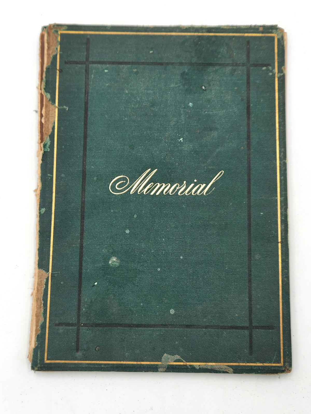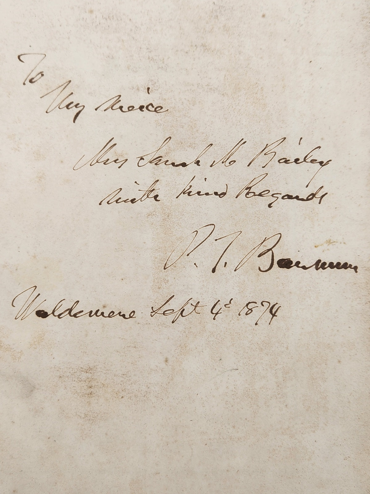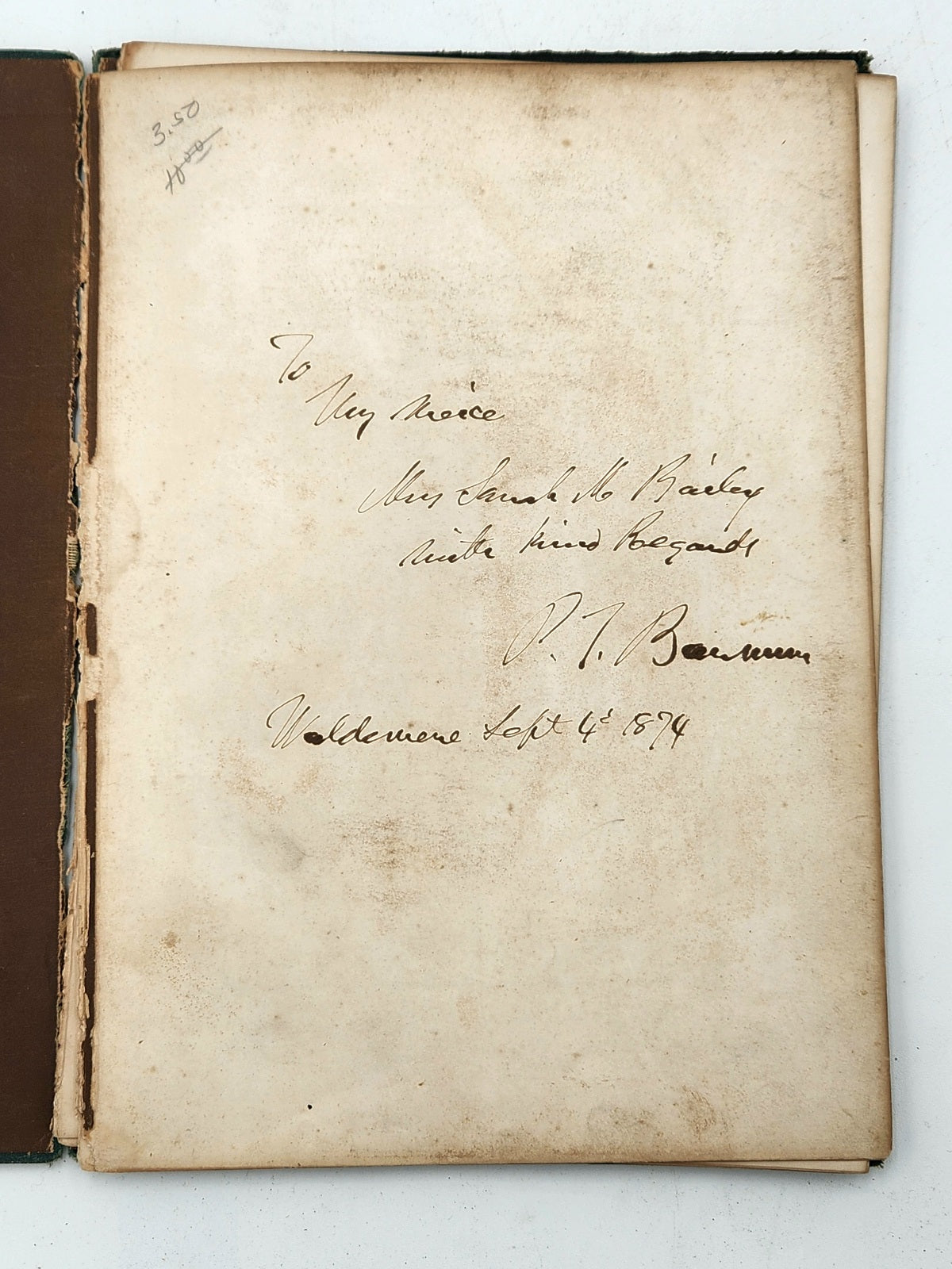 Funeral Service Memorial Book. Only Edition. 4 to 20 pages, verse, text bordered in black. Decorative cloth, beveled edged boards (rubbed, toned and soiled) stamped in black and gilt, a.e.g. Needs conservation: Disbound: spine cloth perished, boards detached, stitching compromised. First brown coated endpaper excised, old penciled pricing at head of front free endpaper, occasional odd spot, otherwise textblock clear and unmarked. Inscribed at ffep: "To My niece, Mrs. Sarah M. Bailey [Sarah M. (Hallett) Bailey (1835-1920)], with kind Regards, P. T. Barnum - Waldemere, Sept. 4th, 1874."