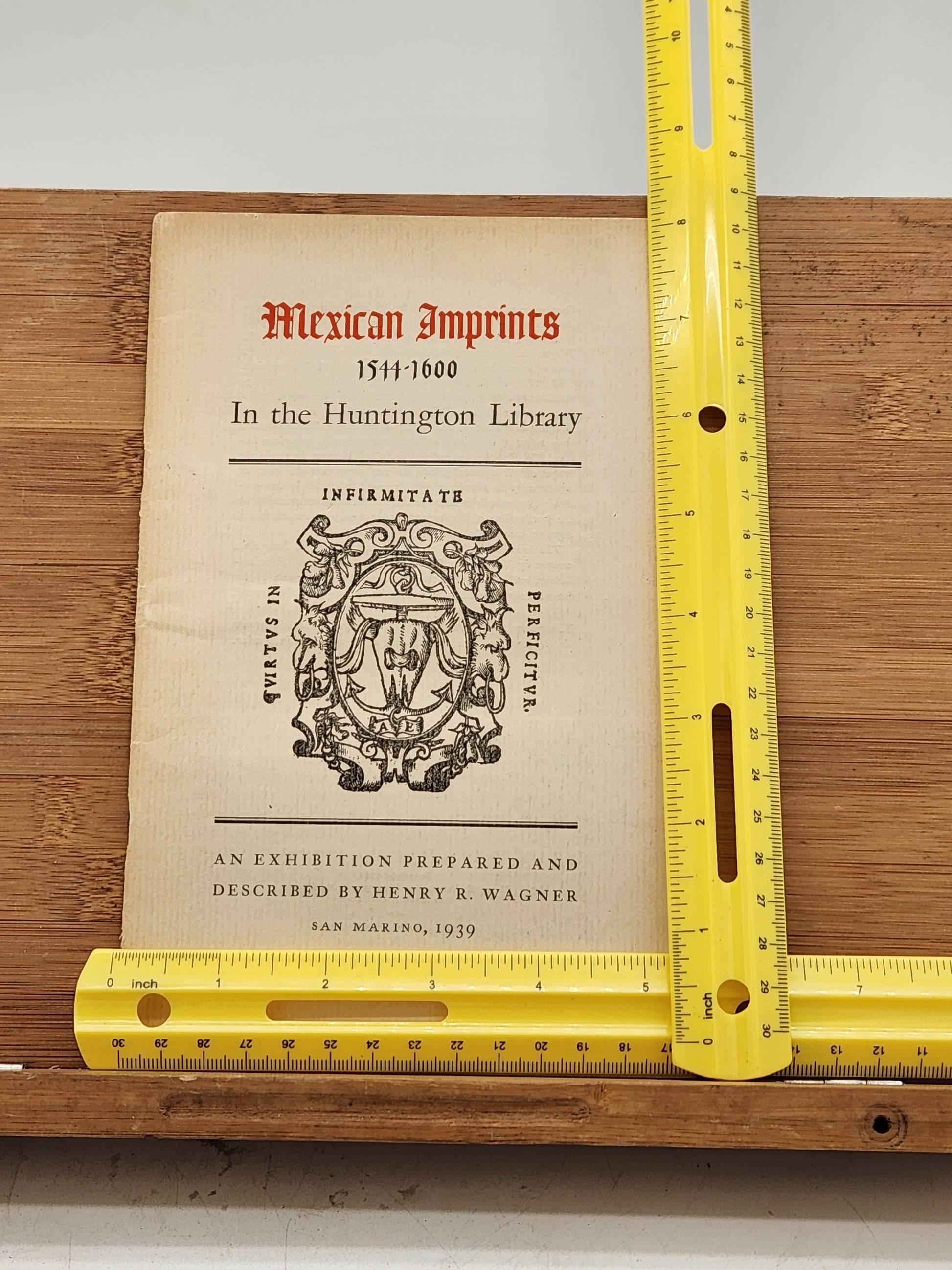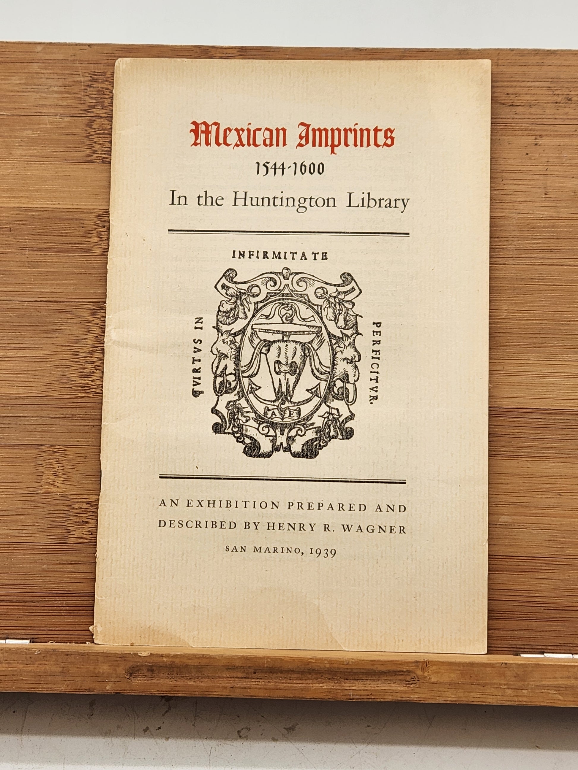 This booklet, "Mexican Imprints 1544-1600 In the Huntington Library," was prepared by Henry R. Wagner for an exhibition in San Marino, California, in 1939. It focuses on early printed materials from Mexico during the 16th century, a period of significant cultural exchange and development following the Spanish conquest. Henry R. Wagner was a renowned historian and bibliographer specializing in the history of the American West and early printing in the Americas.