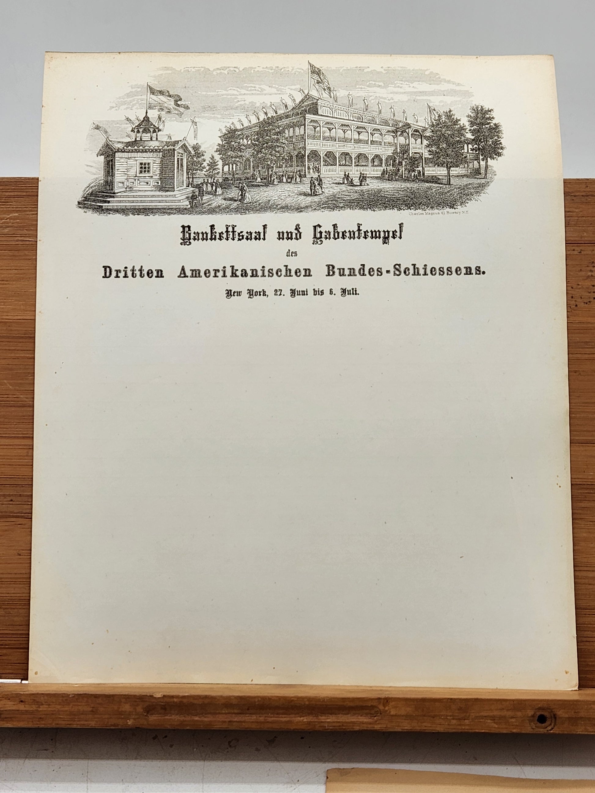 This print depicts the "Schützenhalle, Festhalle und Gabentempel des Dritten Amerikanischen Bundes-Schiessens," which translates to "Shooting Hall, Festival Hall, and Gift Temple of the Third American Federal Shooting Match." It was a popular subject for prints and ephemera in the mid-19th century, particularly among German- American communities. These shooting matches were significant social and cultural events.