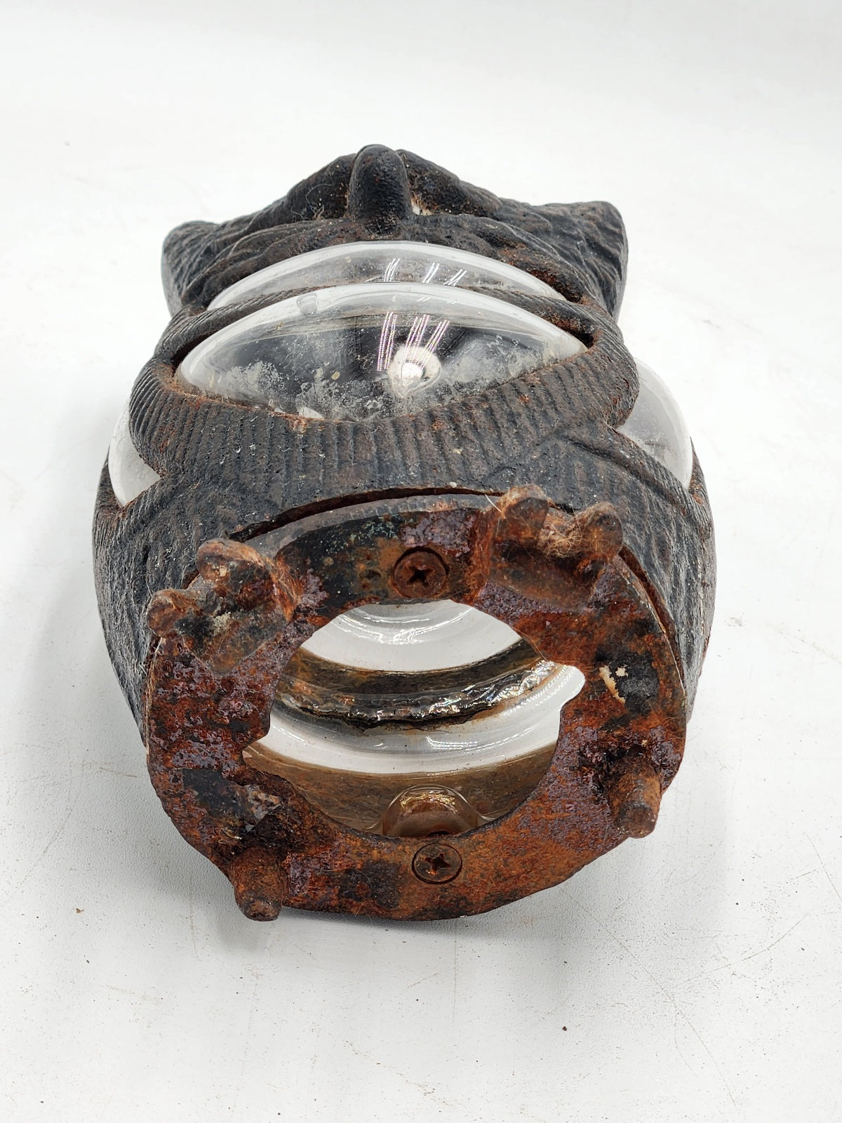 This candle holder/garden lantern seems to be quite rare. It's made out of heavy cast iron and the convex blown glass is in tact. Normal wear you would expect (see pictures) but it's in great shape for it's age.