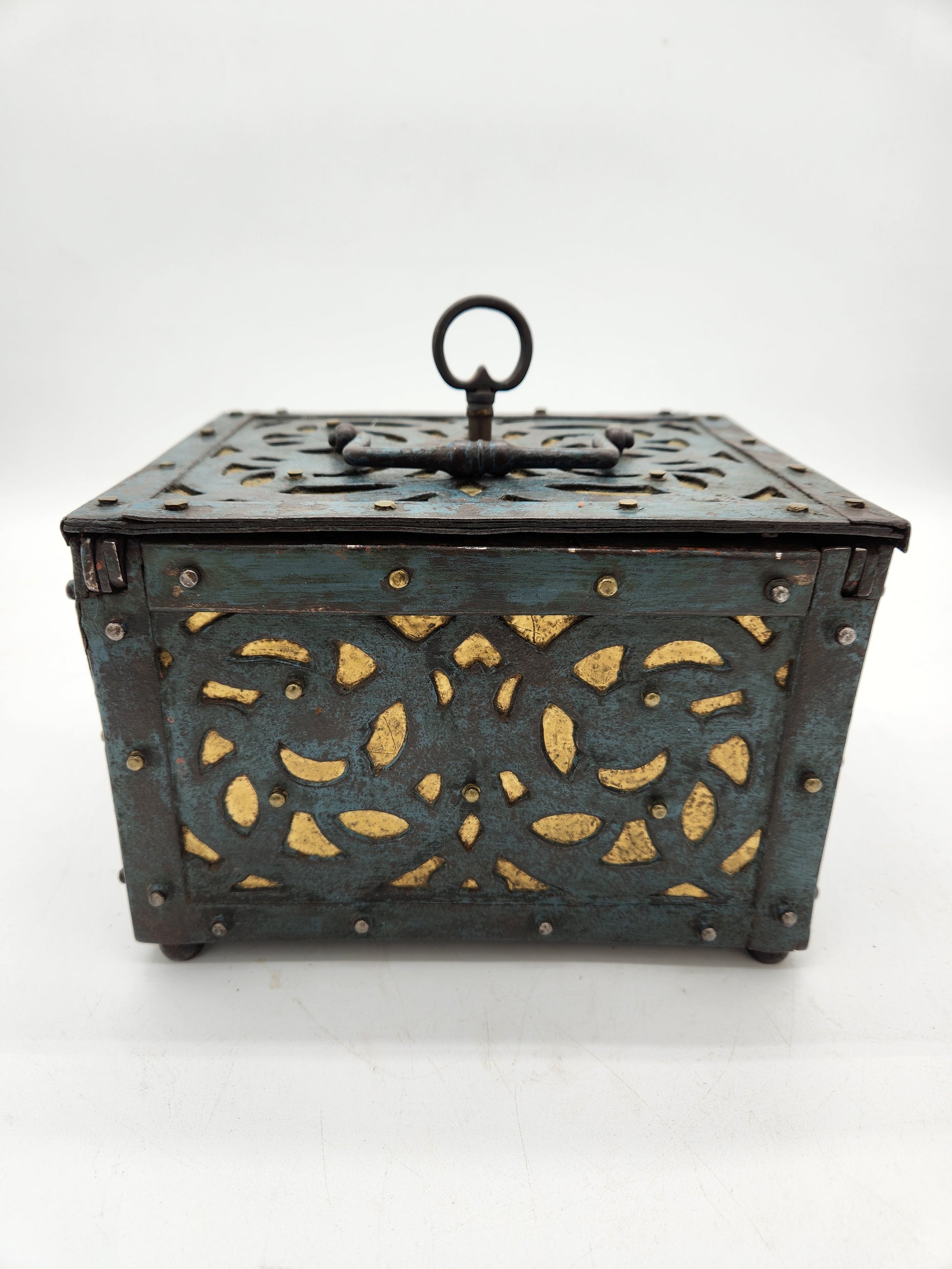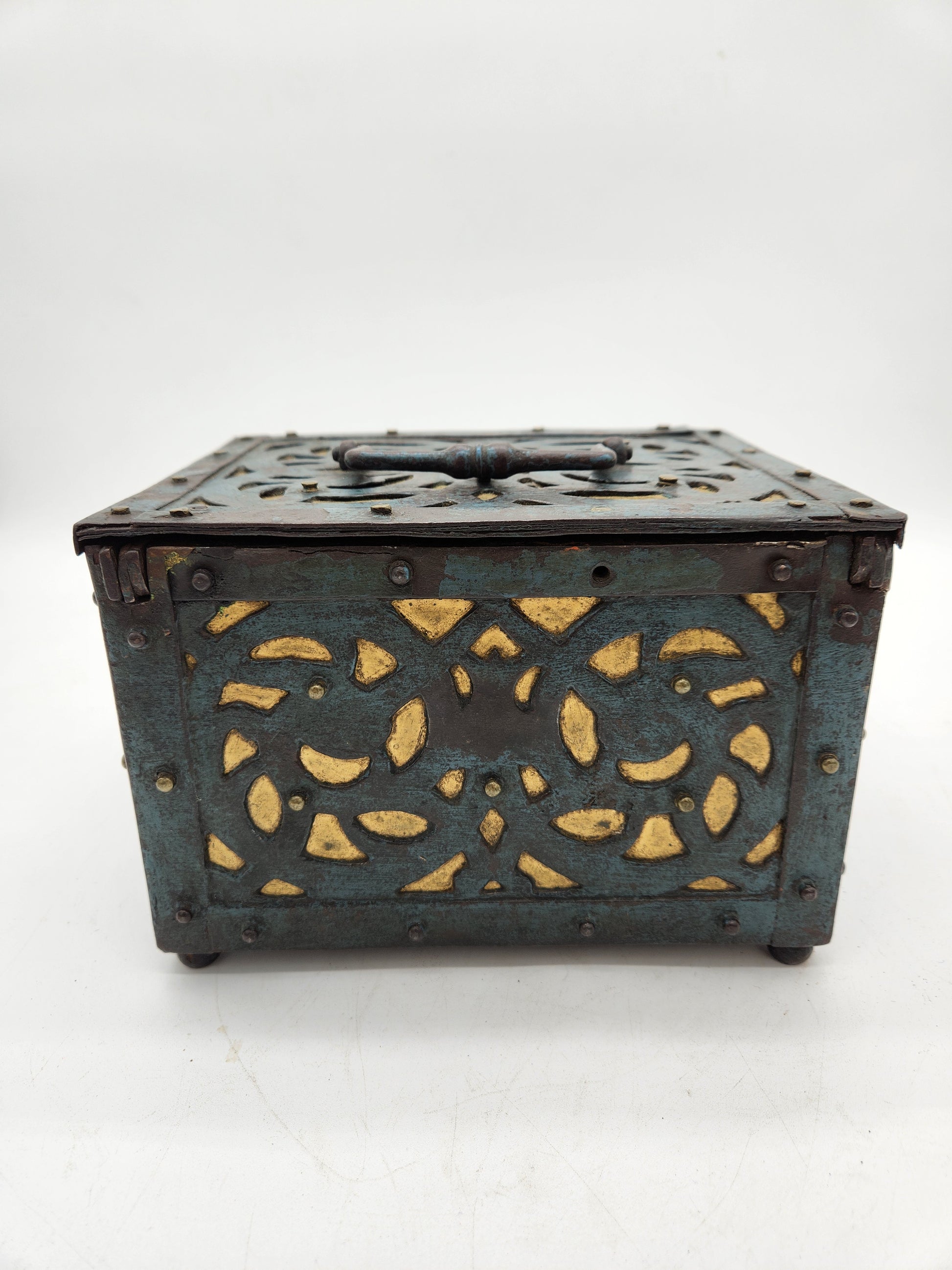 Original late-19th to early-20th century mechanical lock box, constructed of heavy steel with pierced panels and a complex multi-point internal locking mechanism. Designed for securing cash, documents, or valuables in shops, institutions, factories, or offices.