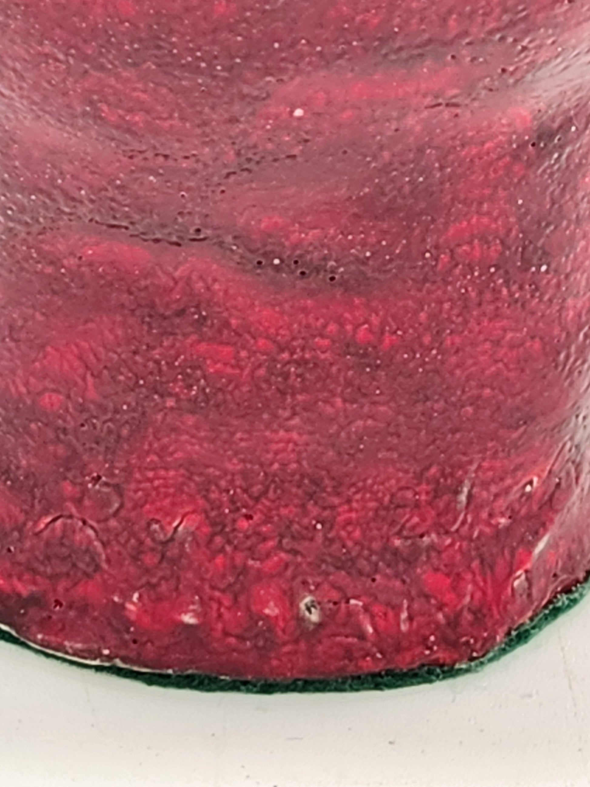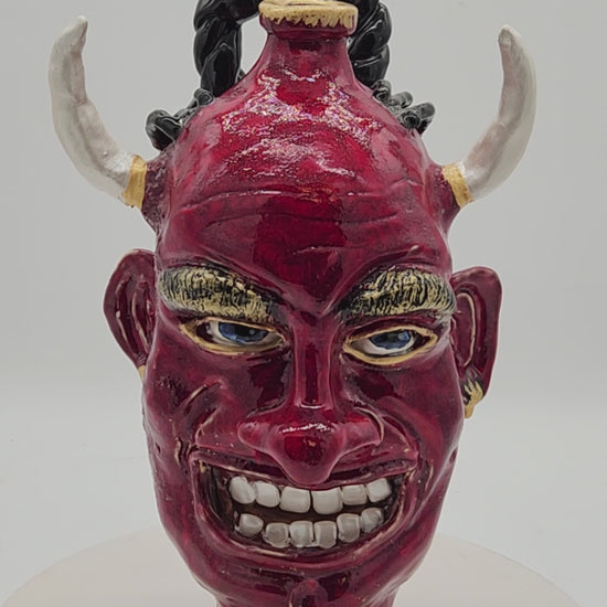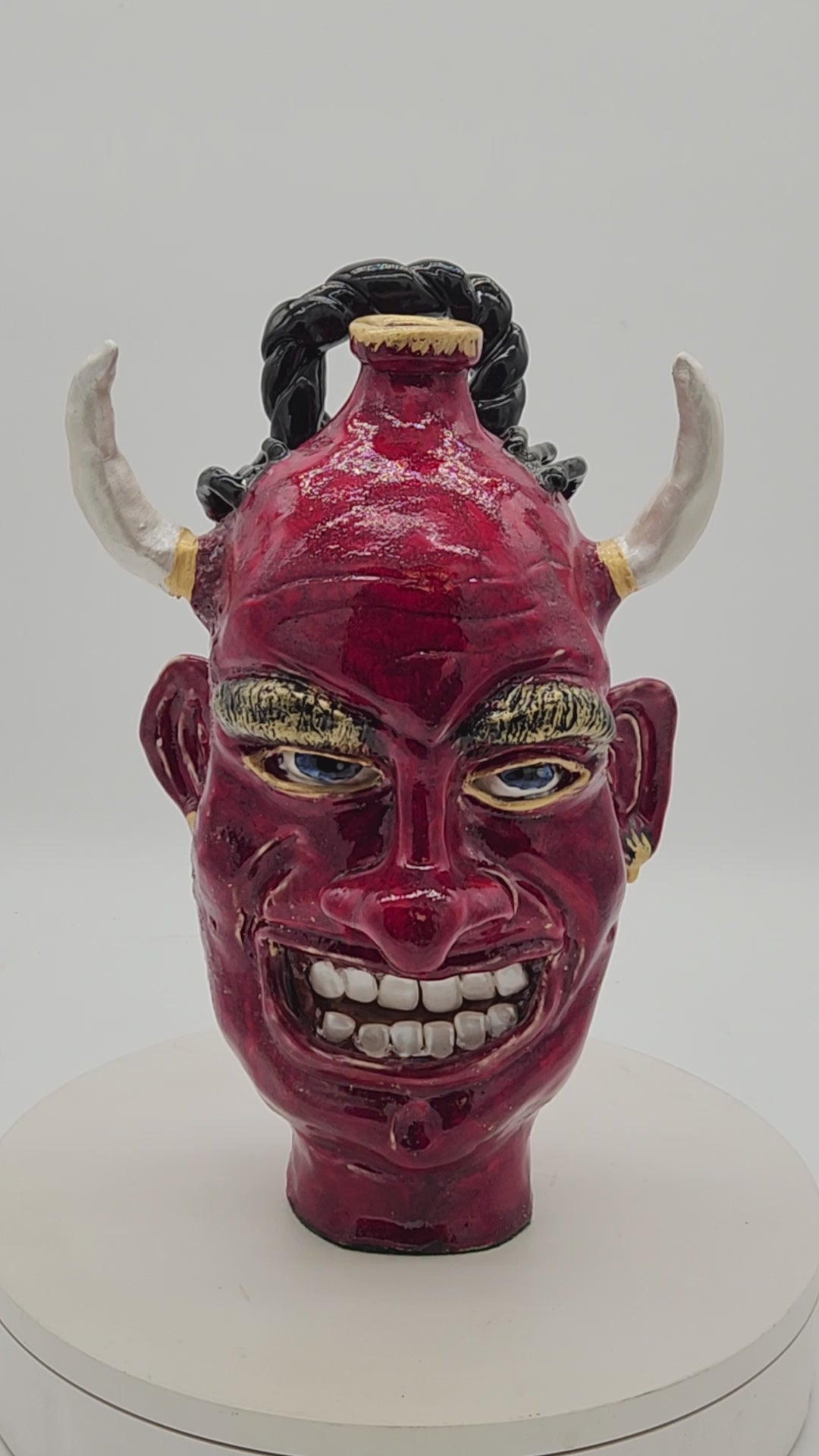 This extraordinary one-of-a-kind ceramic devil jug is a masterful piece of Southern-inspired folk art pottery. Standing approximately 11 inches tall, it features a deeply expressive face with wide, toothy grin, exaggerated features, and dramatic horns. The glossy red glaze has rich depth and texture, accented by black twisted hair, bone-white horns, and gold highlights.