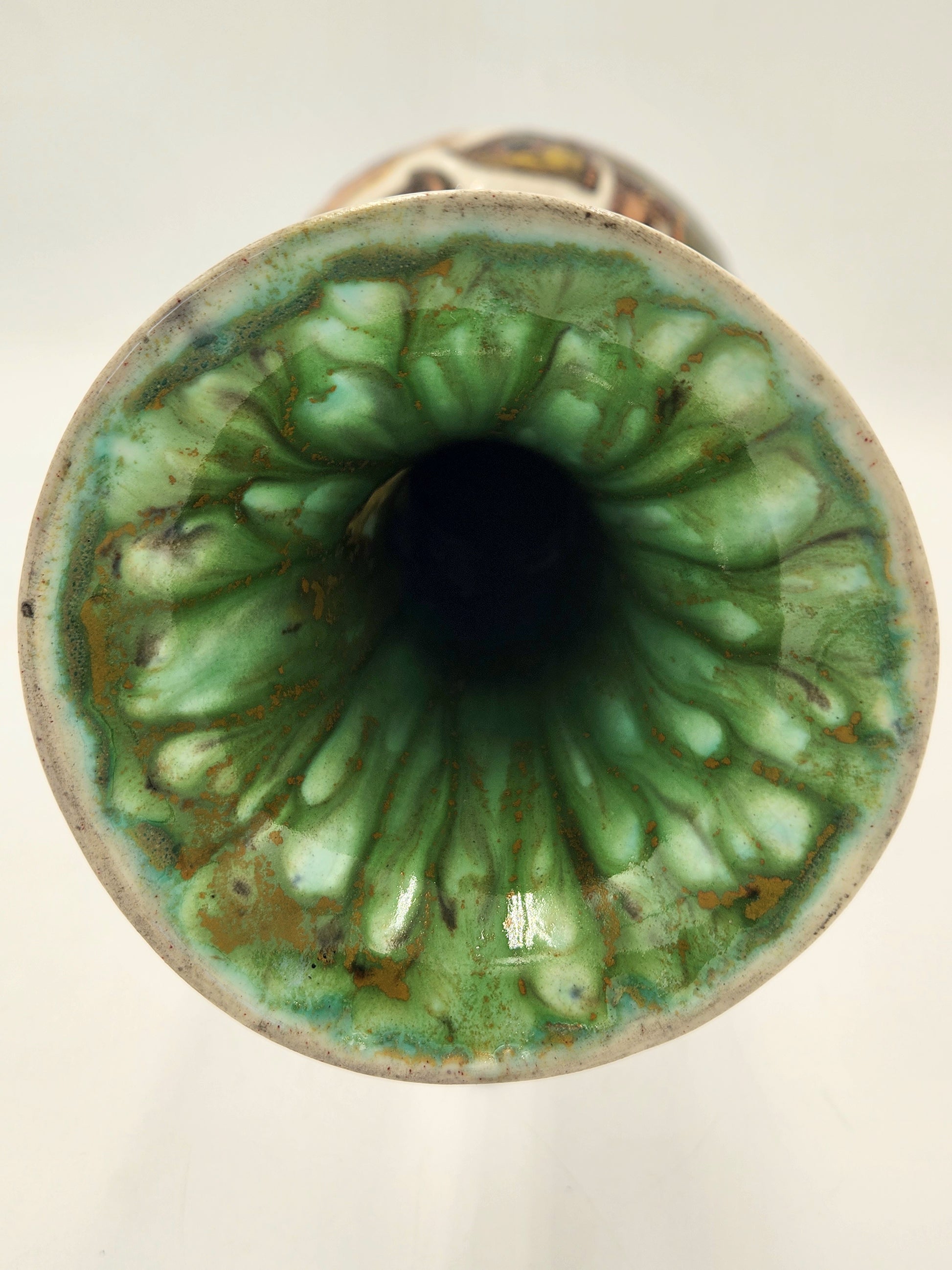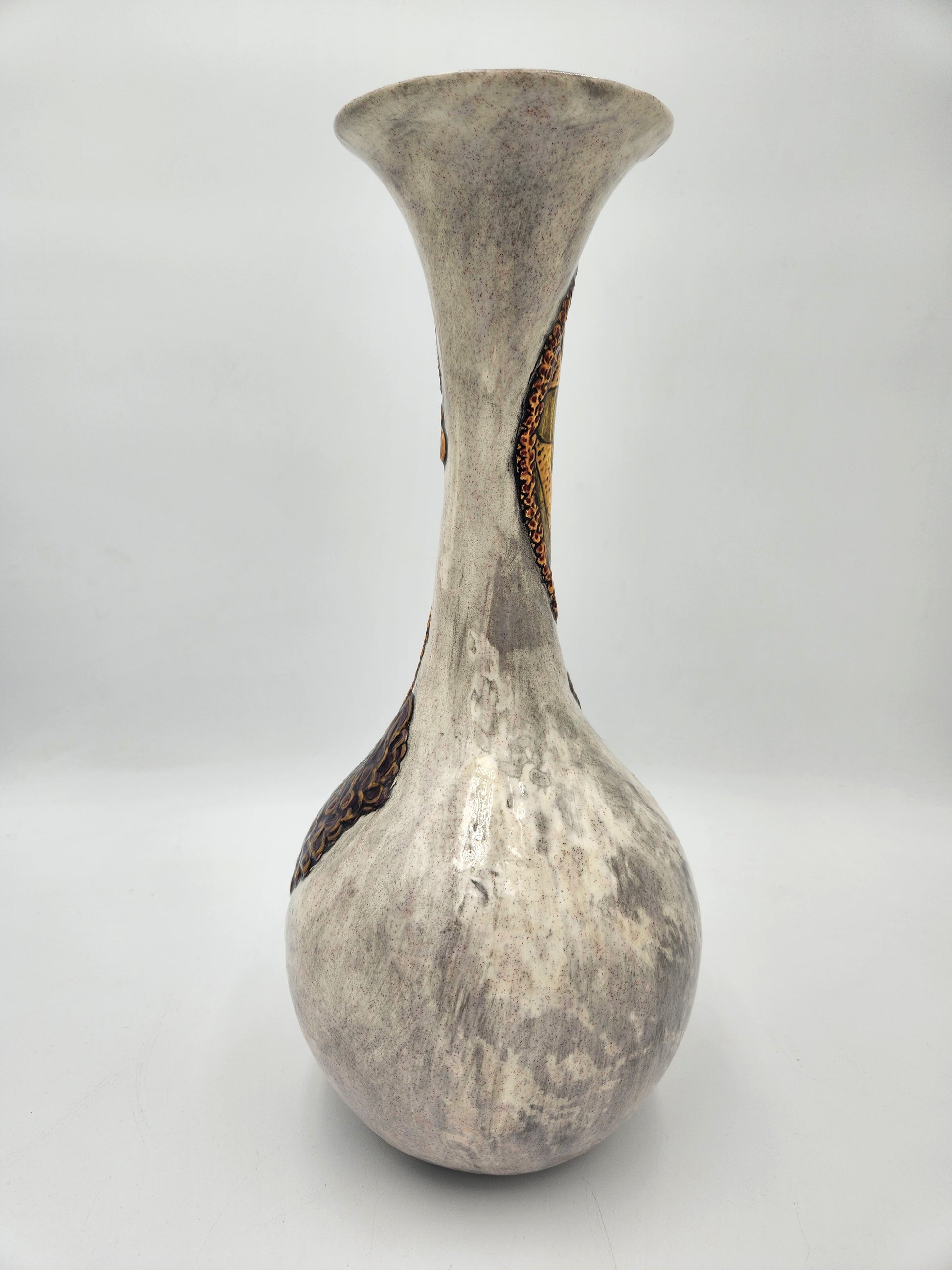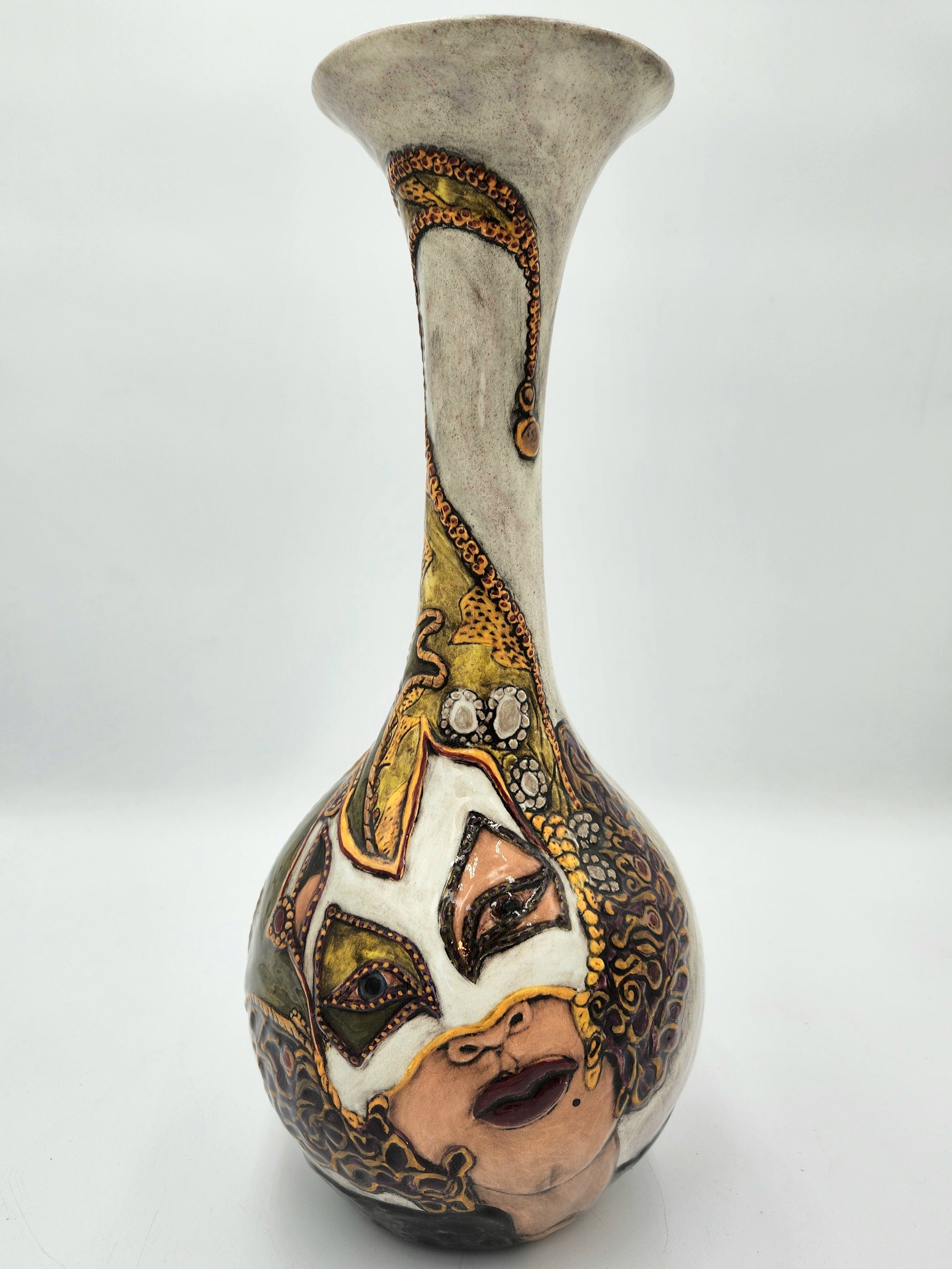 One of a kind vase, likely handcrafted by a New Orleans artist. This vase features a masked woman dressed in a Mardi Gras mask.