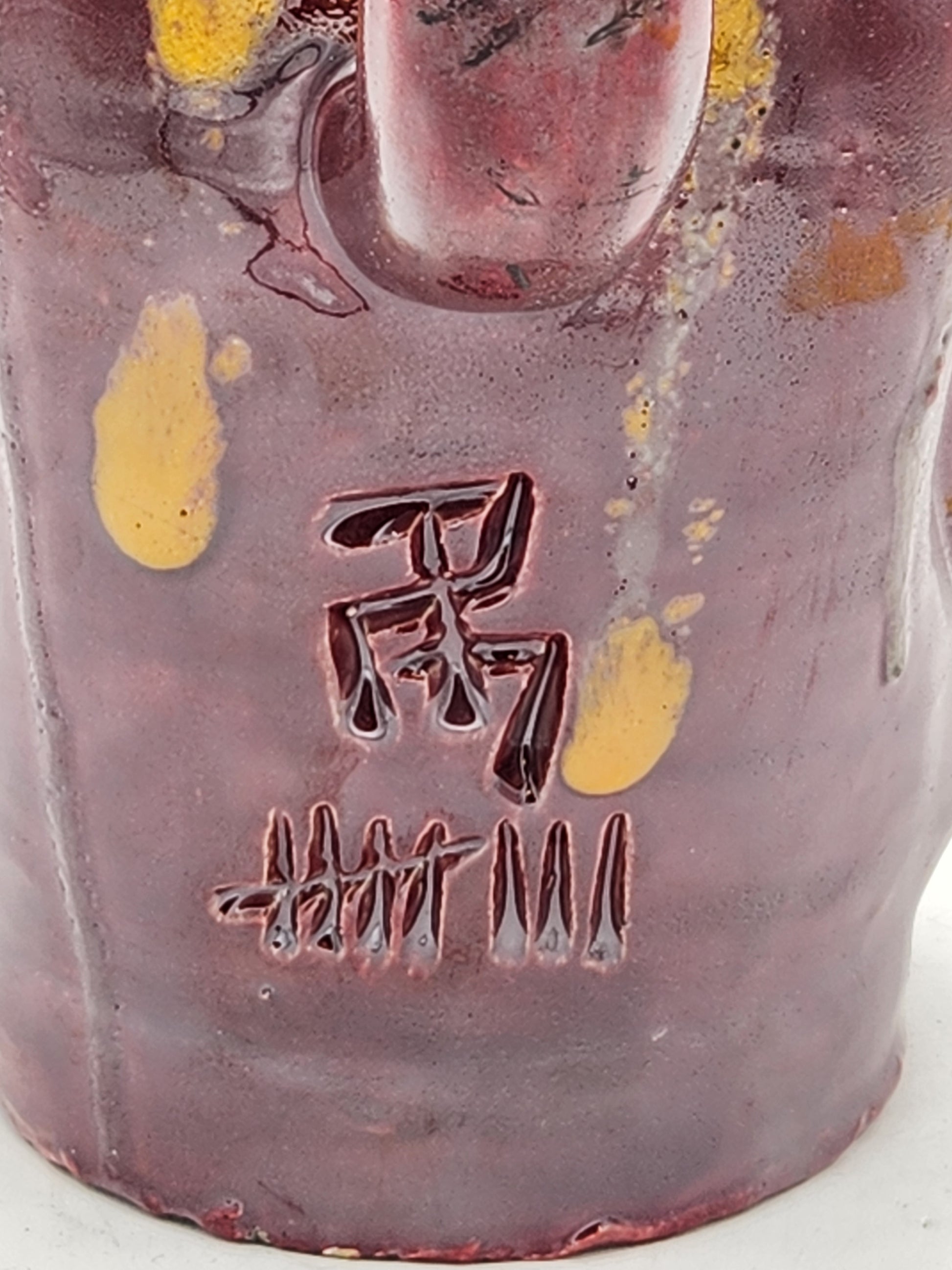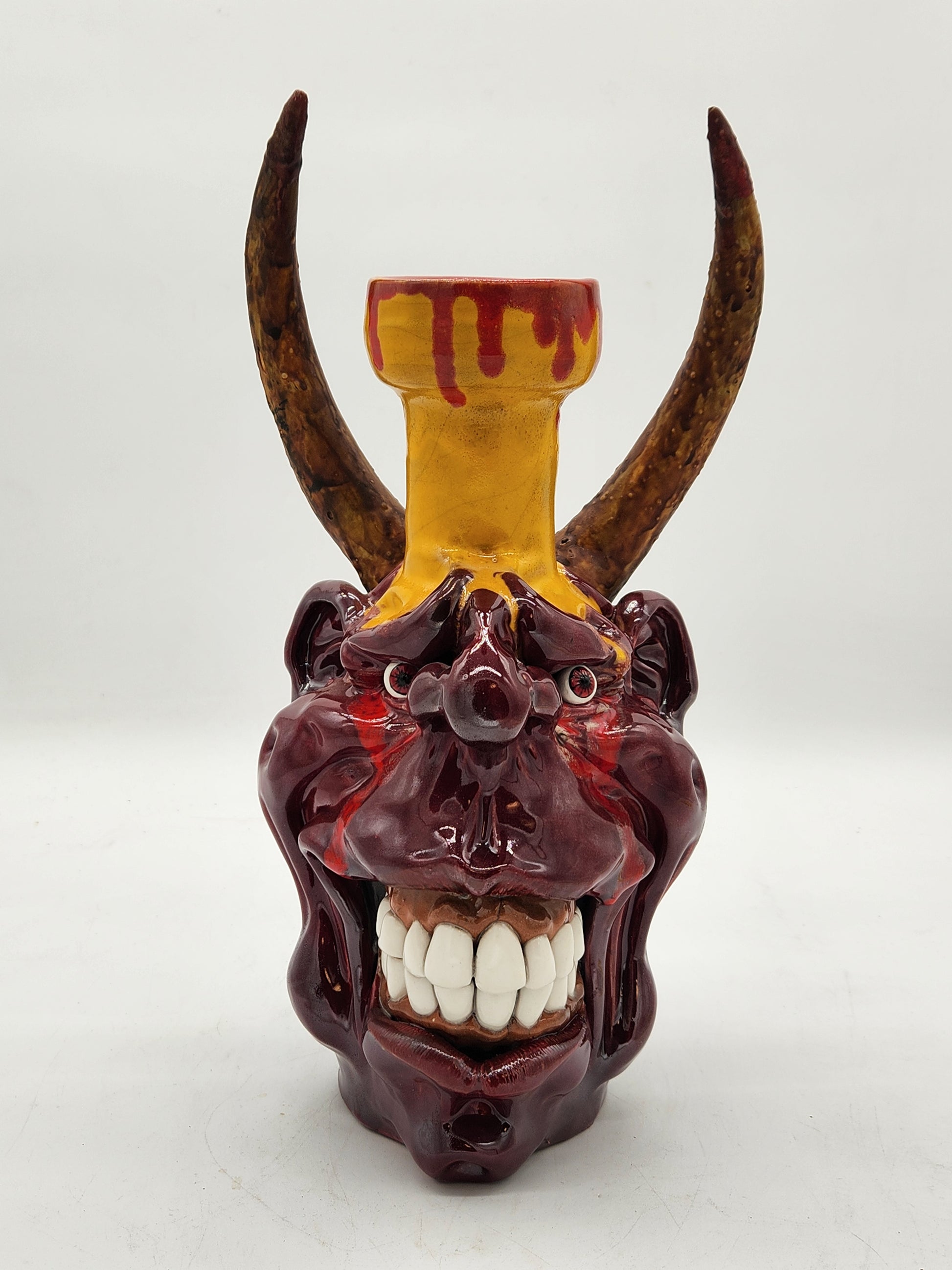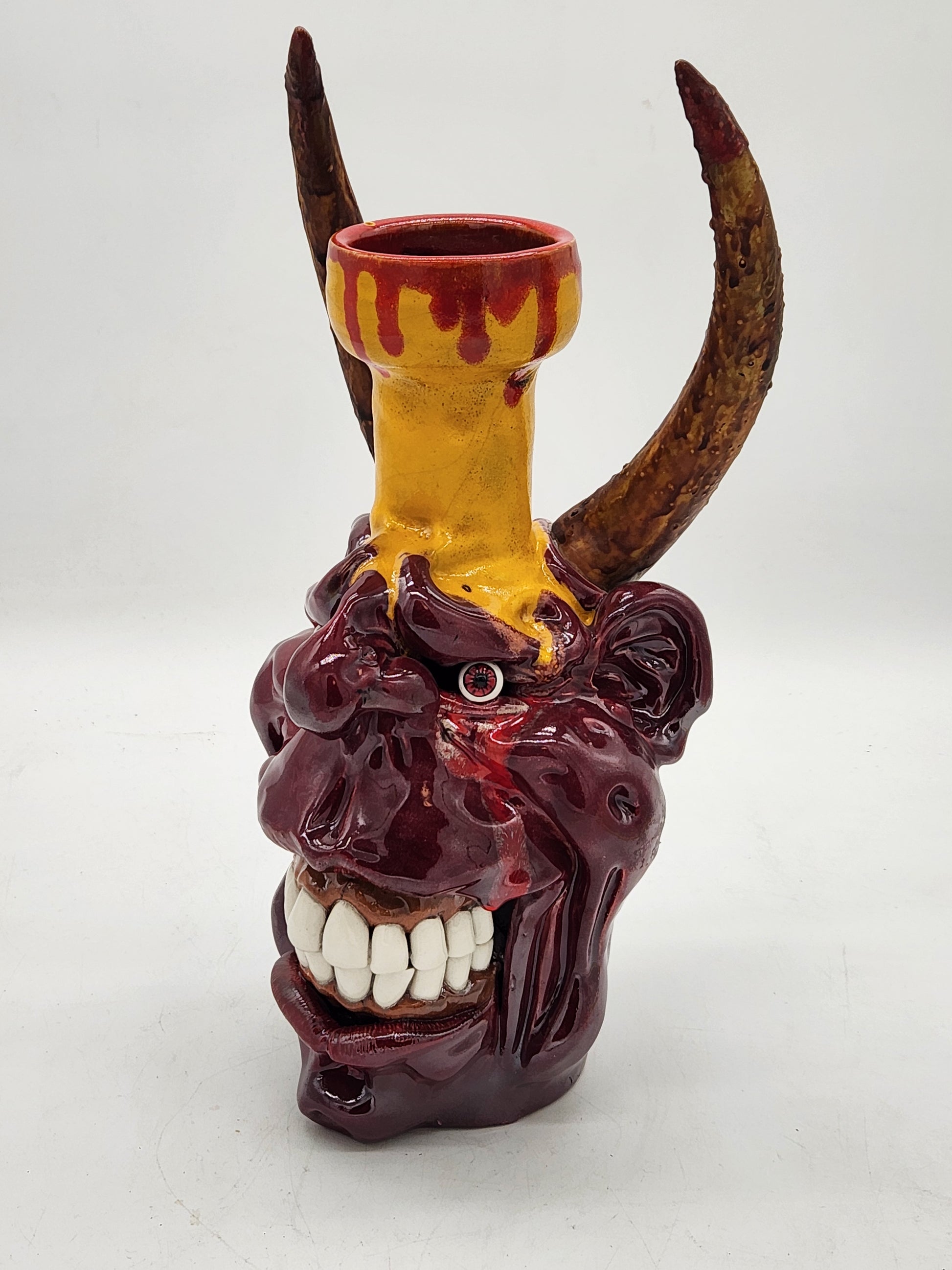 Exceptional hand-sculpted ceramic demon or devil face jug, approximately 14" tall with large horns and vivid layered glazes. Deep burgundy body glaze with flowing yellow-and-red “drip” accent on the neck. Signed on the back with an incised symbol and tally marks, denoting the artist’s series. I have 3 pieces available from this series.