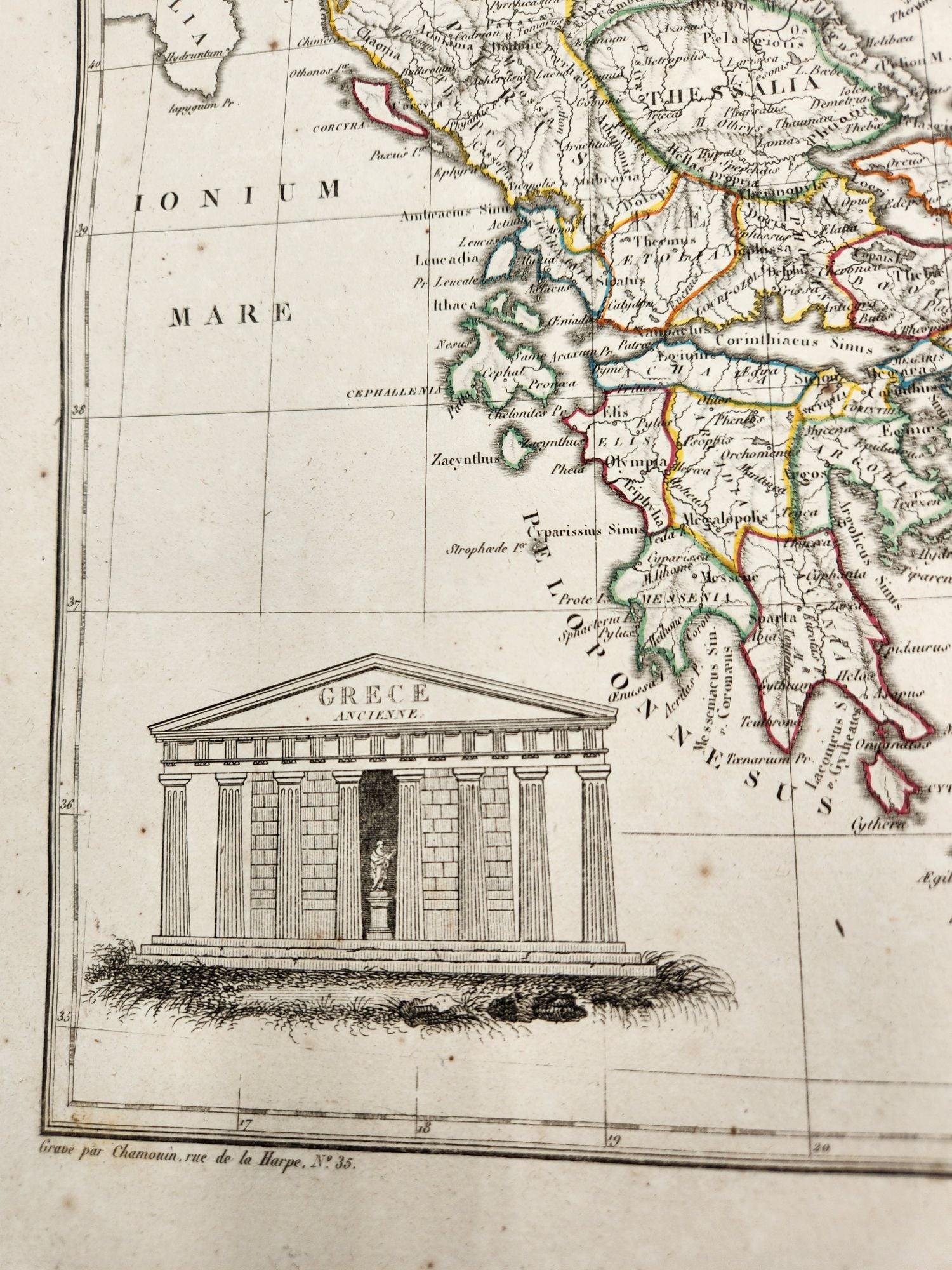 This is an antique, hand-colored map of Ancient Greece/Grece Ancienne from the Atlas Complet du Precis de la Geographie Universelle de M. Malte-Brun, by Lapie, 1812. Colored by region and featuring a decorative cartouche. Good antique condition. See photos. Page size is approximately 14.25 x 11 inches.