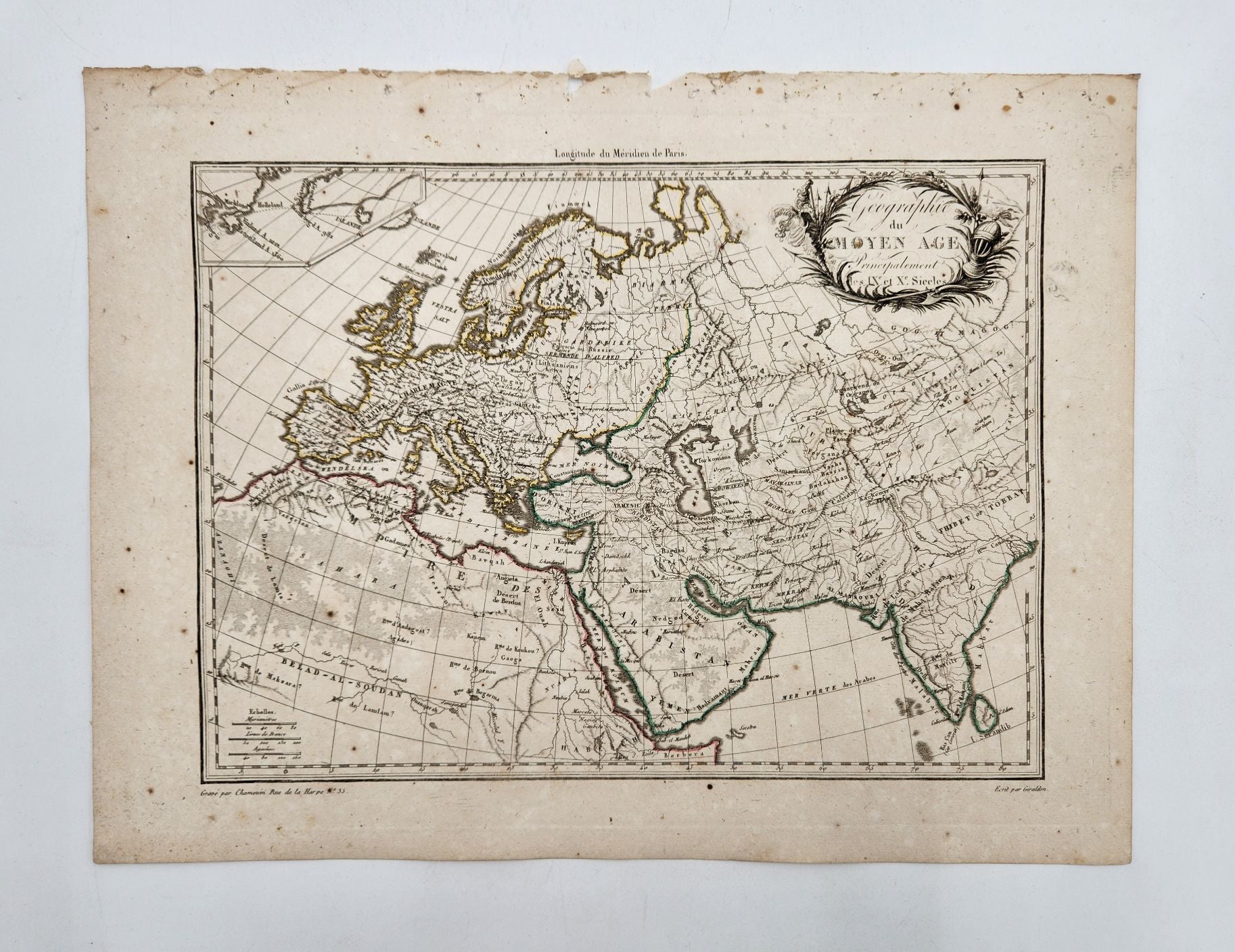 This is an antique, hand-colored map of Geographie du Moyen Age Principalement (geography of the middle ages) from the Atlas Complet du Precis de la Geographie Universelle de M. Malte-Brun, by Lapie, 1812. Colored by region and featuring a decorative cartouche. Good antique condition. See photos. Page size is approximately 14.25 x 11 inches.