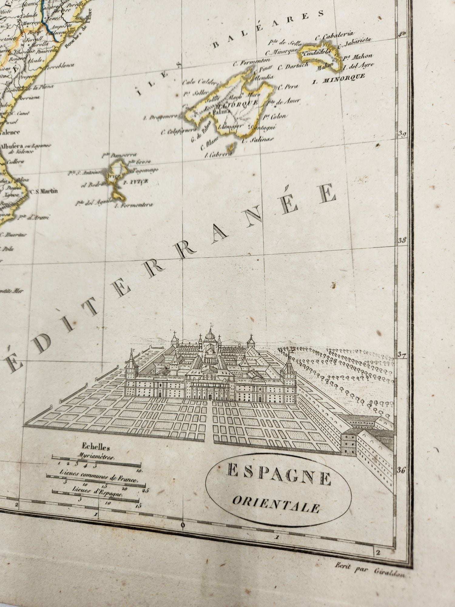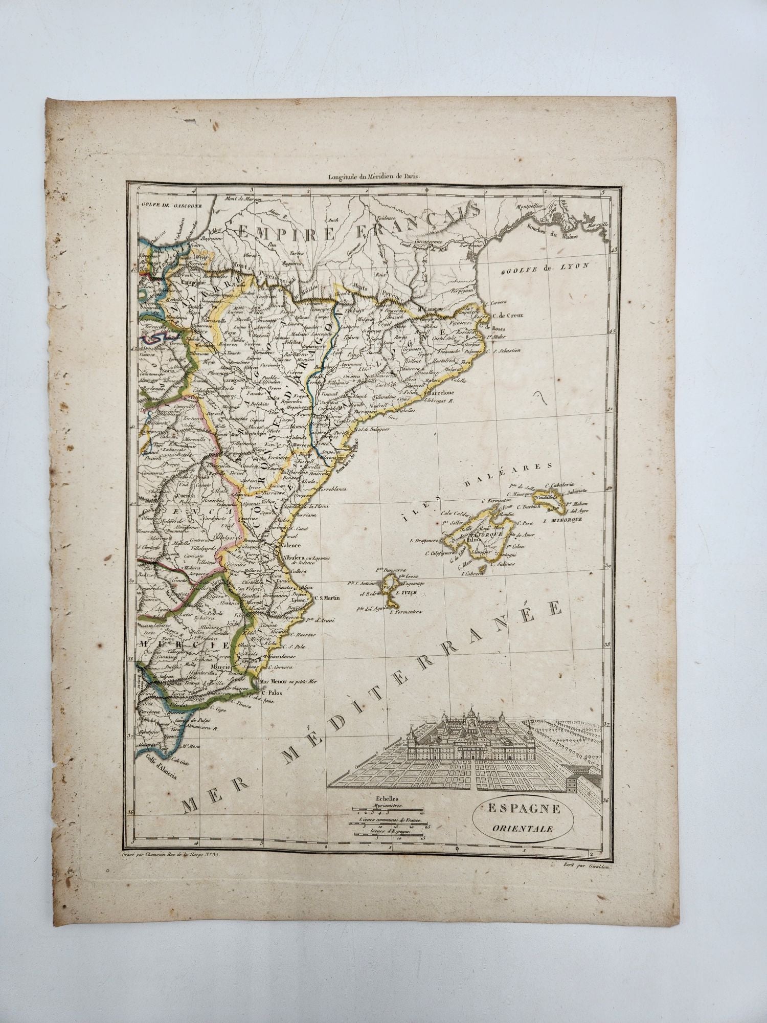 This is an antique, hand-colored map of Spain Cataluna from the Atlas Complet du Precis de la Geographie Universelle de M. Malte-Brun, by Lapie, 1812. Colored by region and featuring a decorative cartouche. Good antique condition. See photos. Page size is approximately 14.25 x 11 inches.