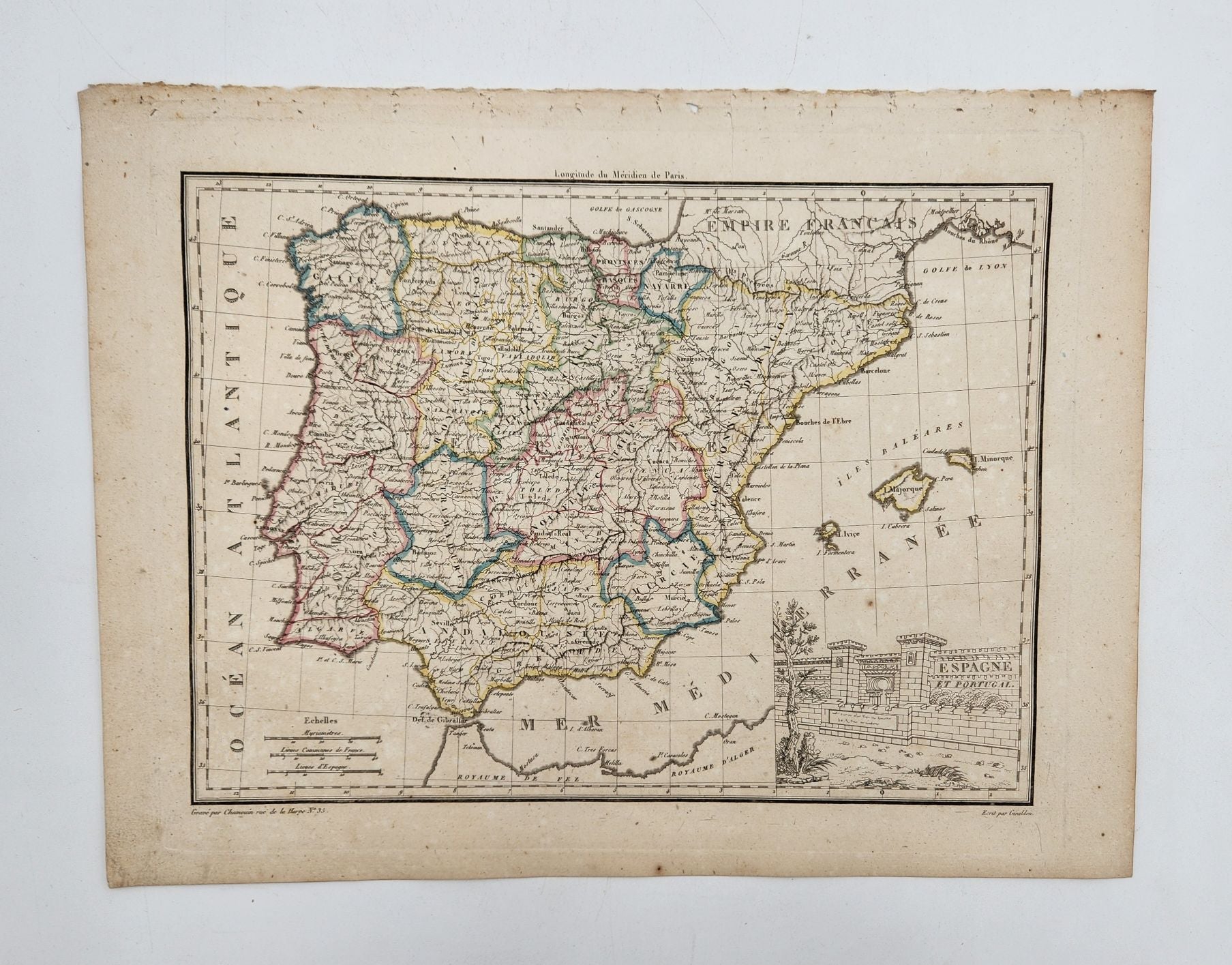 This is an antique, hand-colored map of Spain, Portugal from the Atlas Complet du Precis de la Geographie Universelle de M. Malte-Brun, by Lapie, 1812. Colored by region and featuring a decorative cartouche. Good antique condition. See photos. Page size is approximately 14.25 x 11 inches.