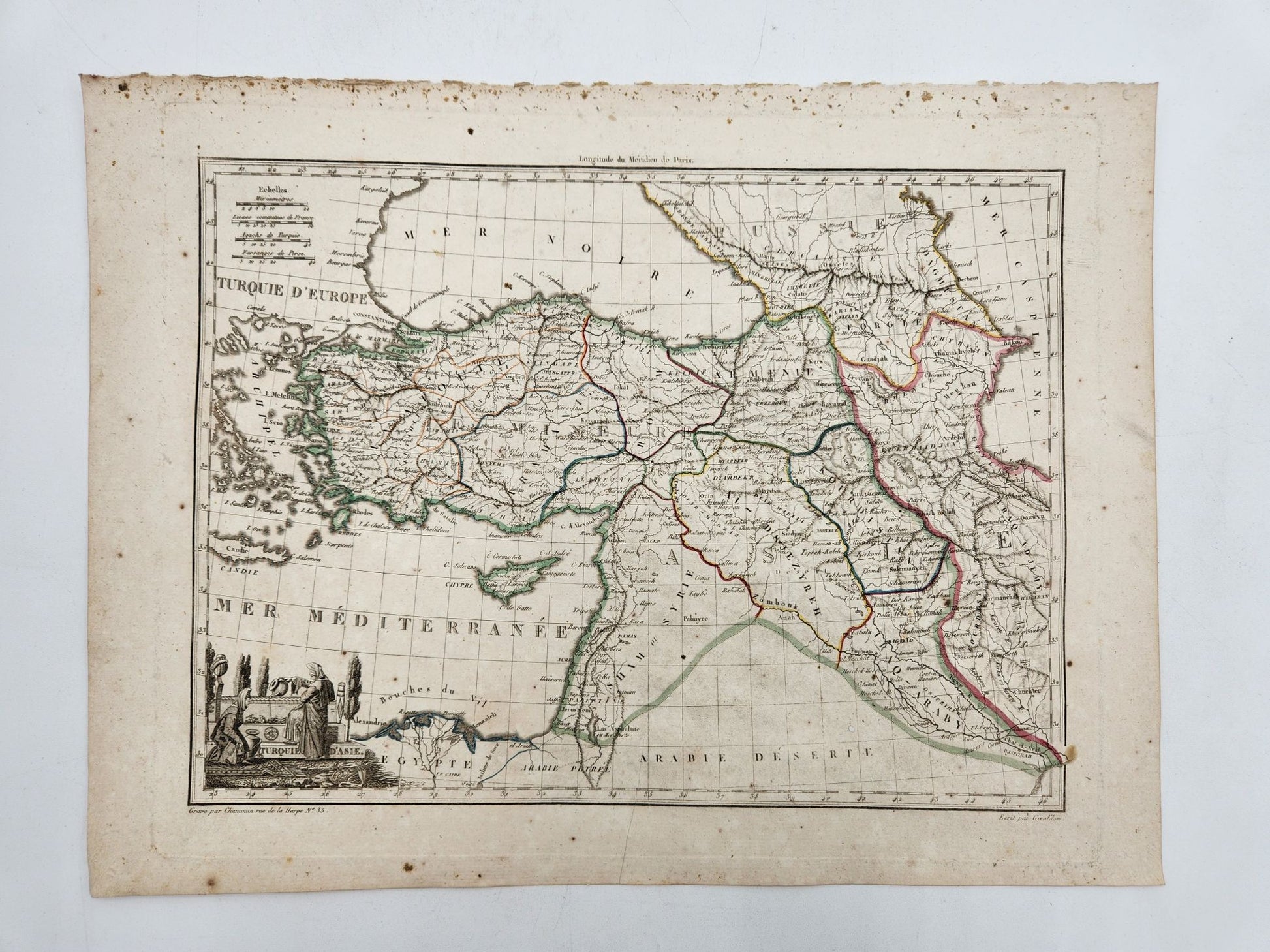 This is an antique, hand-colored map of Turkey/Iraq from the Atlas Complet du Precis de la Geographie Universelle de M. Malte-Brun, by Lapie, 1812. Colored by region and featuring a decorative cartouche. Good antique condition. See photos. Page size is approximately 14.25 x 11 inches.
