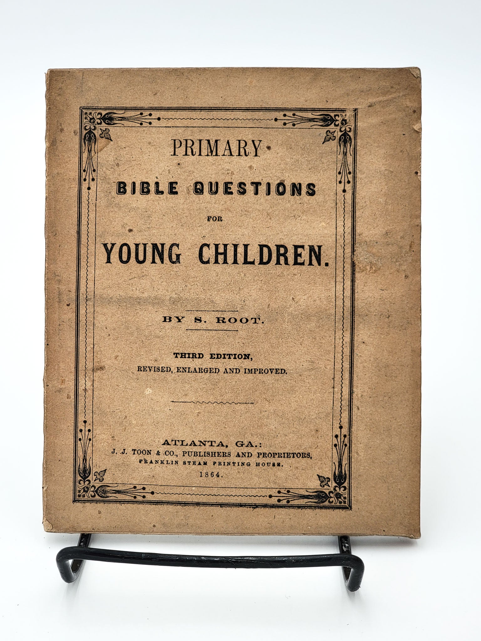RARE and the best example I've seen online. Fully intact. Primary Bible Questions for Young Children By Sidney Root Published: J. J. Toon & Co, Atlanta, 1864.Approx. 6" x 4". [1], 80 pages. Dulled yellow stiff wraps. Title and decorative border on front wrap and school book advertisement by the publisher printed on the rear wrap. Third Edition, Revised, Enlarged and Improved. Toning to text. Third Edition, Revised, Enlarged and Improved. A truly beautiful copy of this SCARCE work.
