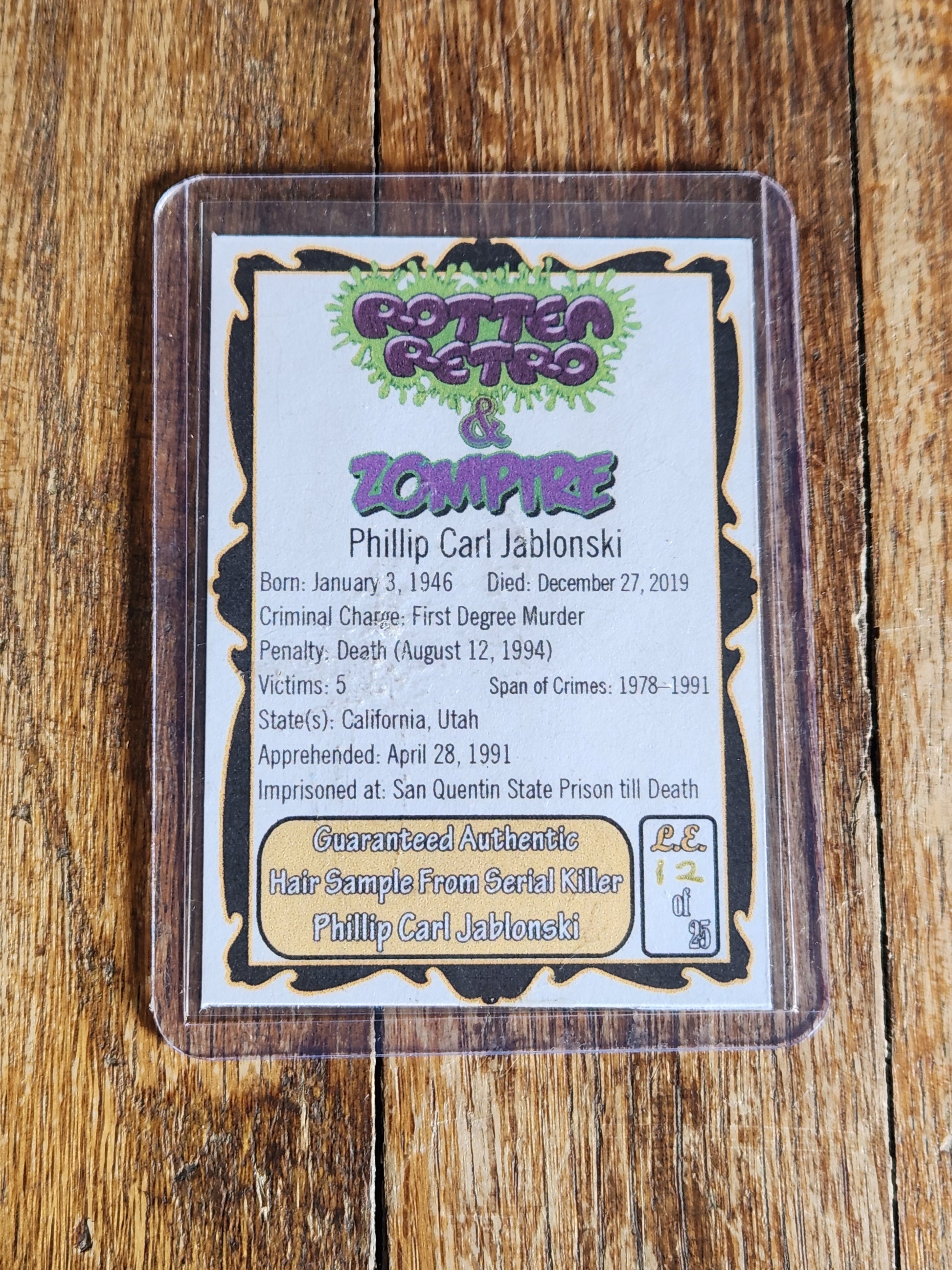 Phillip Carl Jablonski Hair Sample Relic Card. An ultra-rare, authenticated biological relic featuring hair from the serial killer. This piece is the highly sought-after #1/25, the first card in the limited edition run by Rotten Retro & Zompire.