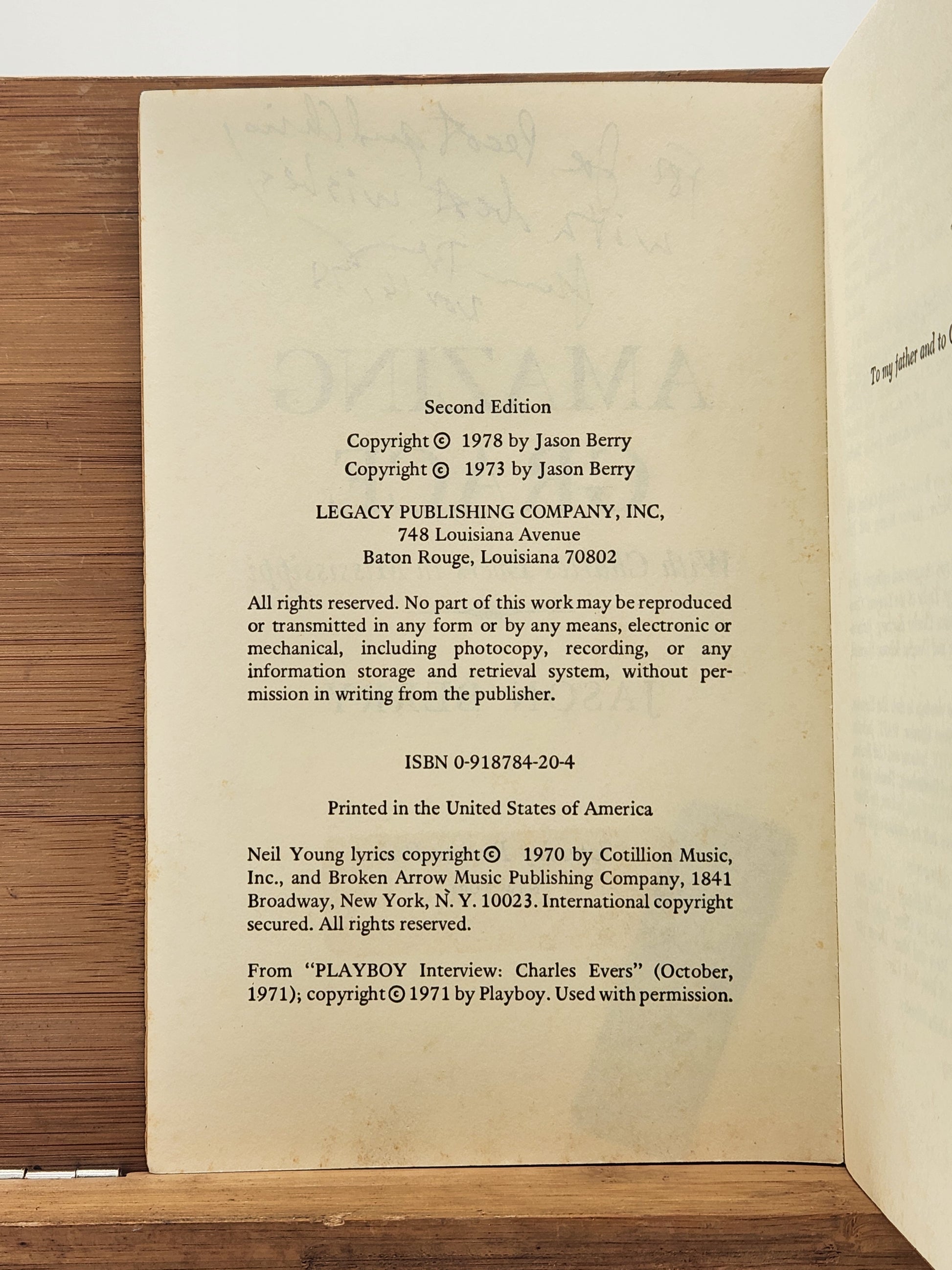 Signed second edition (1978) of Amazing Grace: With Charles Evers in Mississippi by Jason Berry. Published by Legacy Publishing Company, Baton Rouge. Signed and dated by the author on the title page (Nov. 16, 1978).