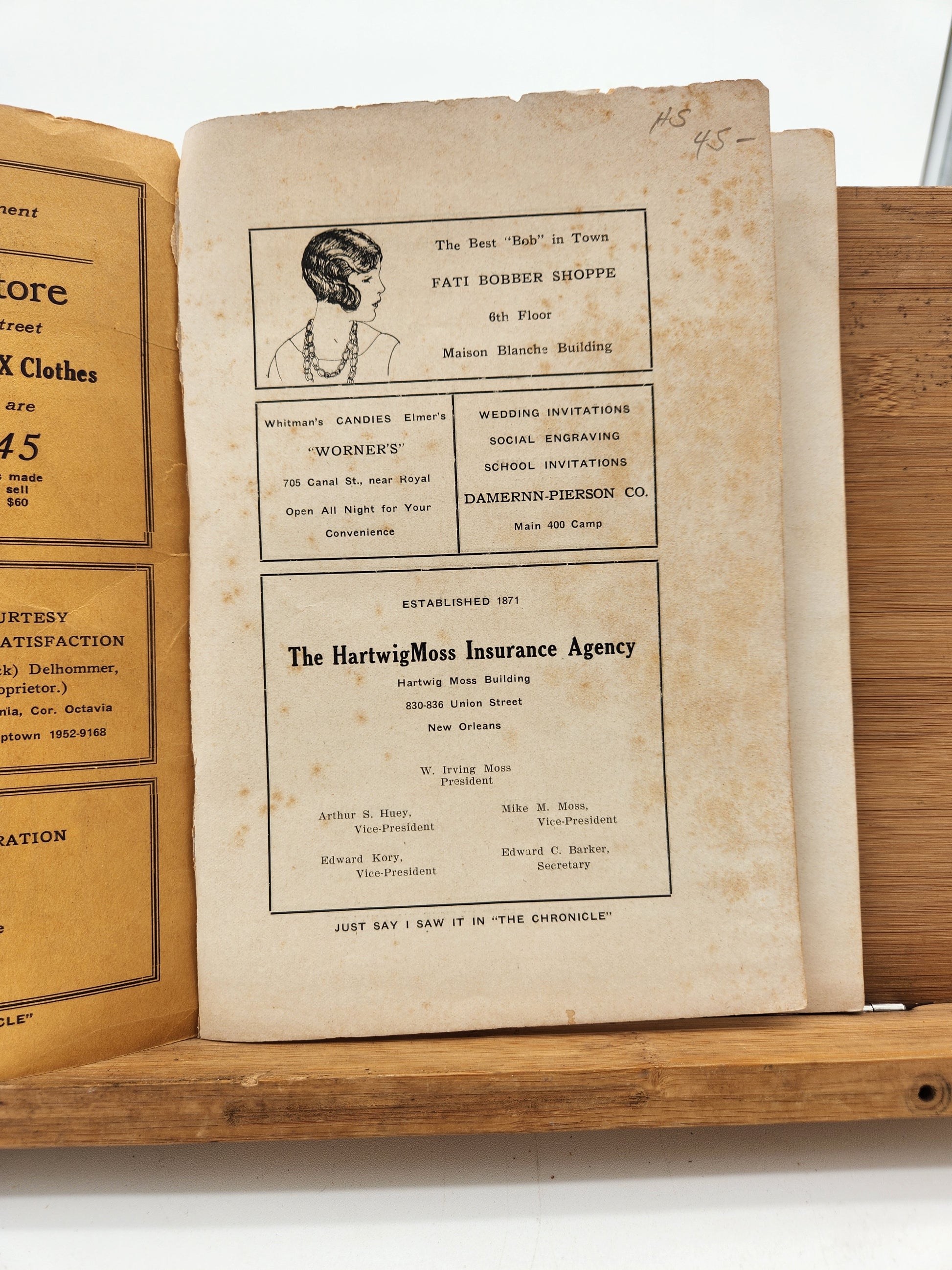 This type of ephemeral publication is rarely found outside institutional archives and offers a snapshot of student life, local advertising, and art style in 1920s New Orleans.