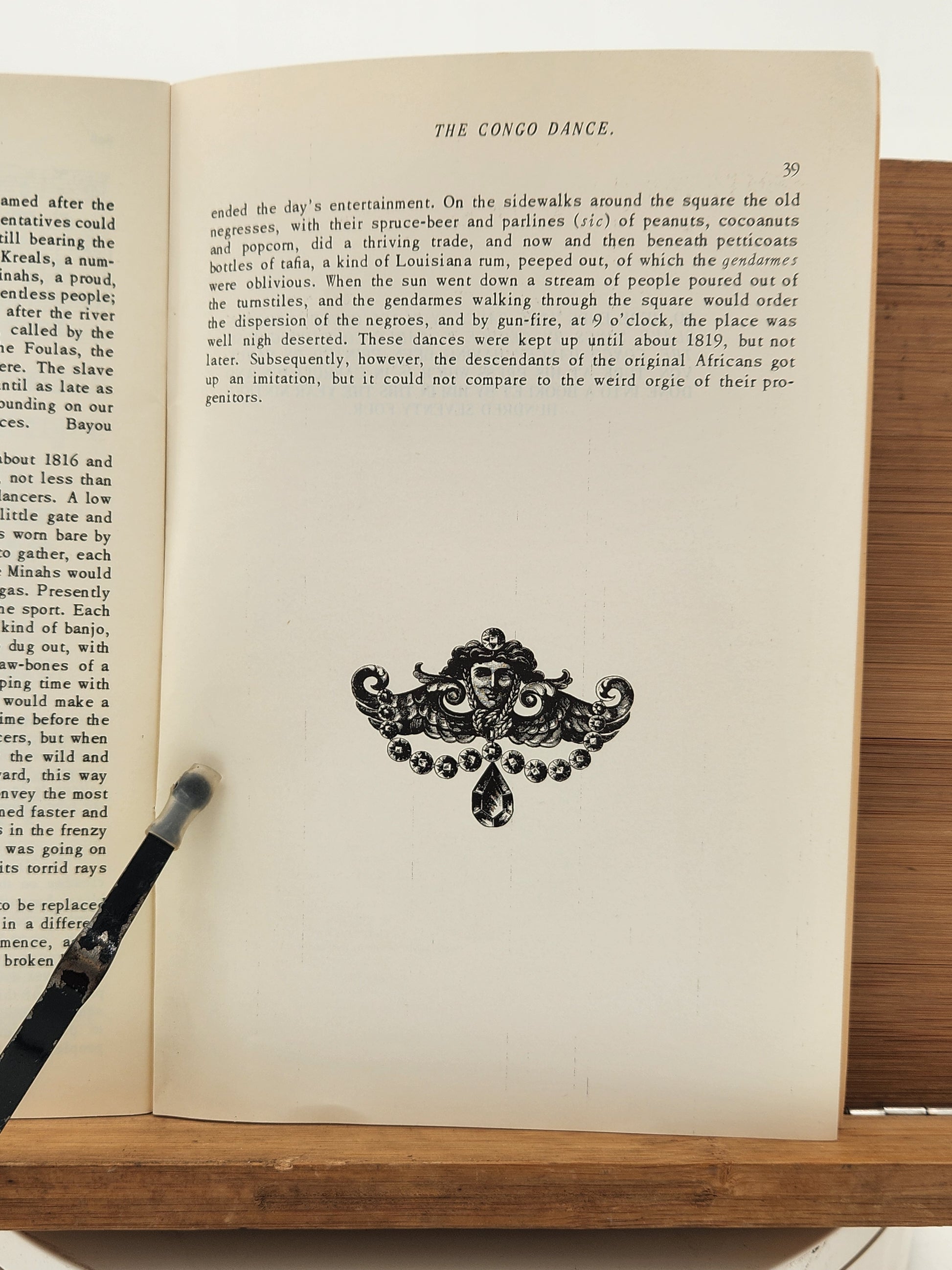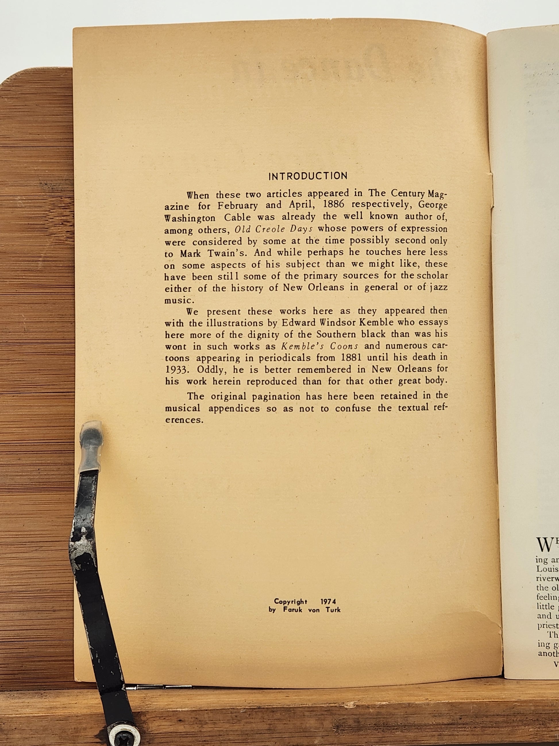 Facsimile reprint of George W. Cable’s 1886 essays “The Dance in Place Congo” and “Creole Slave Songs,” originally published in The Century Magazine. This 1974 edition, issued by Faruk von Turk, reproduces the original text and illustrations by Edward Windsor Kemble, capturing one of the earliest written accounts of African and Creole music and dance in New Orleans’ historic Congo Square. A significant piece for collectors of Louisiana history, early jazz origins, and African American cultural studies.