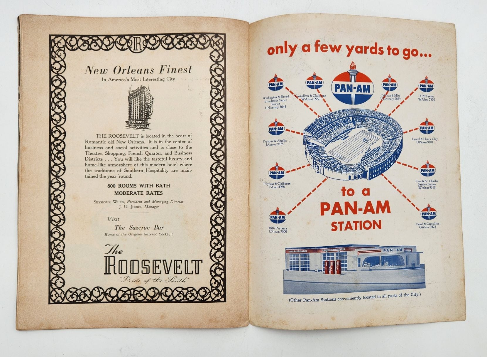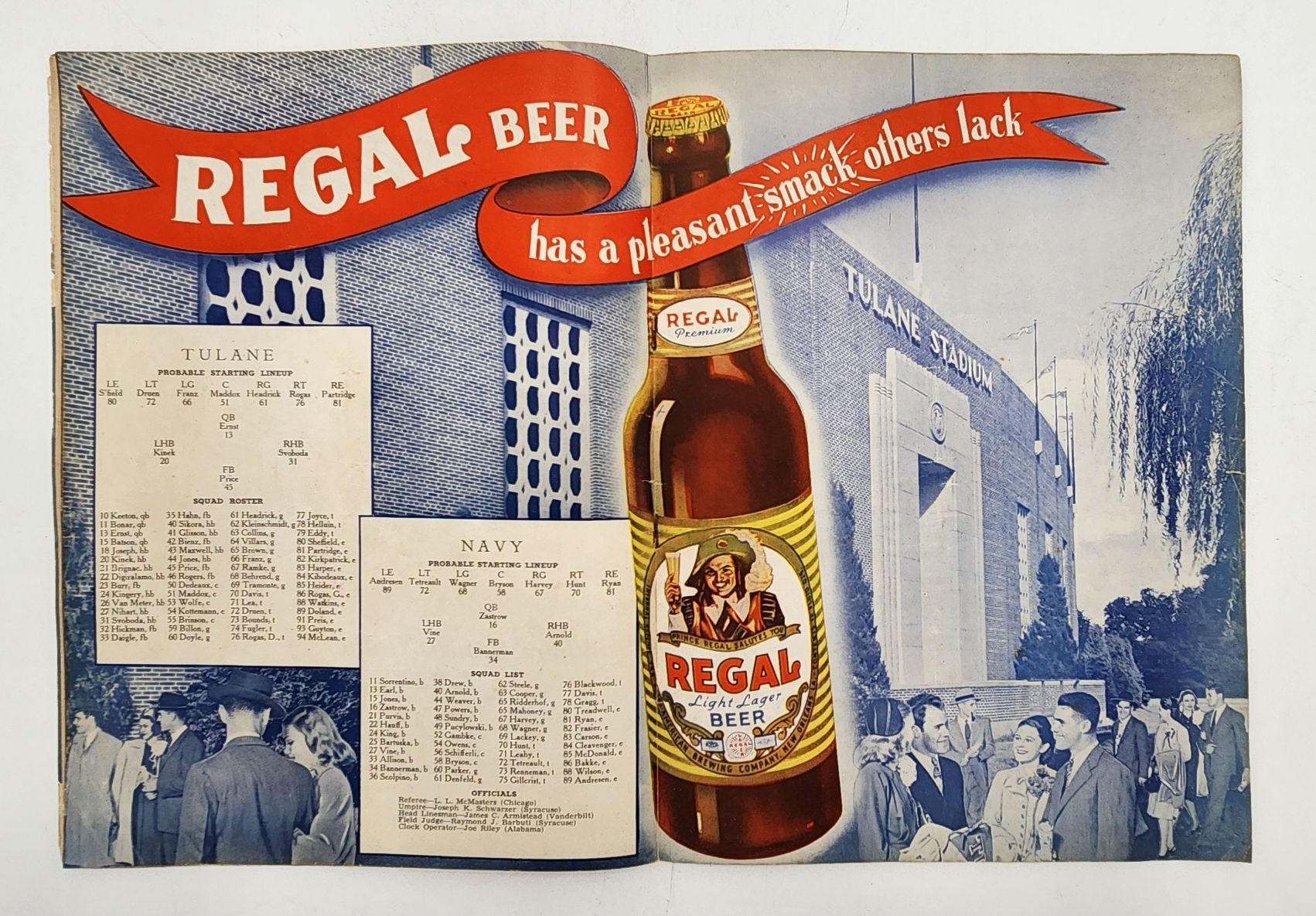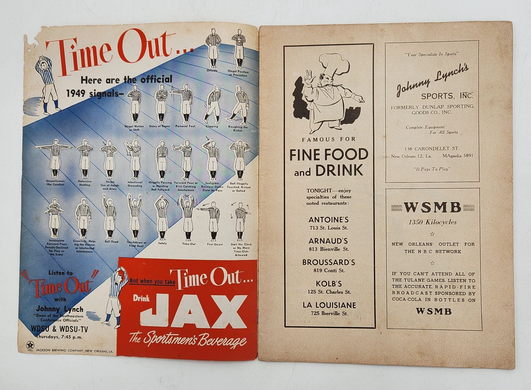 This Tulane Vs. Navy program from November 5, 1949 is in good condition for it's age and is full of nastalgic ads and images from old New Orleans football. There is a small hole in the cover and other minor issues. See photos.