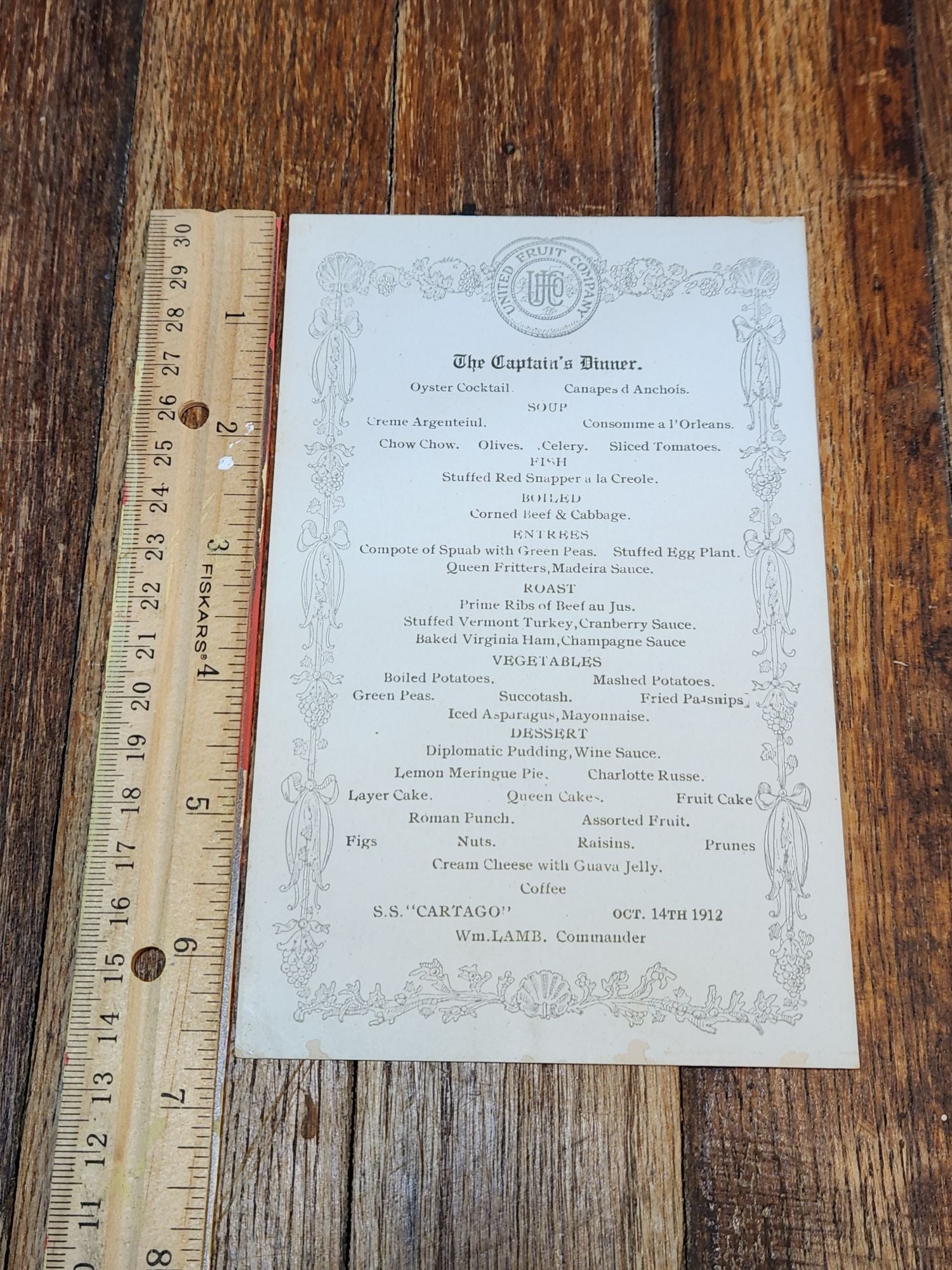 United Fruit Company, The Captain's Dinner menu