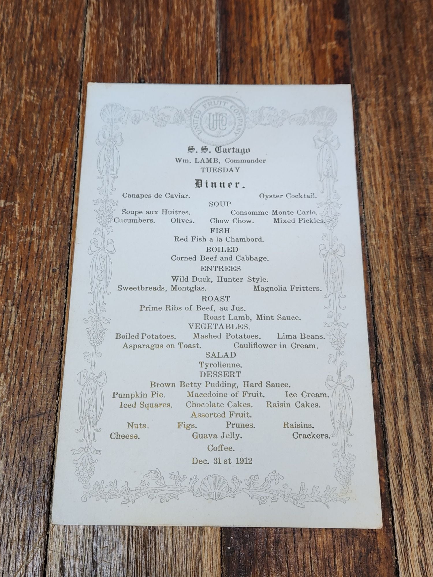 United Fruit Company, Tuesday Dinner. Dec. 31st 1912