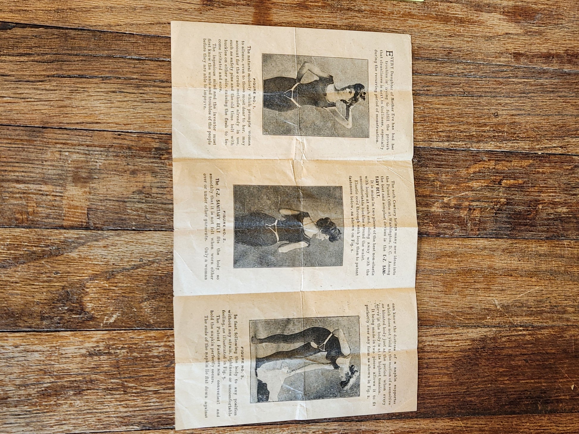 This complete multi-panel circular includes period photographic illustrations showing proper wear, detailed usage instructions, and contemporary medical language addressing menstruation, modesty, and cleanliness—subjects rarely preserved in original printed form due to social taboos of the era.
